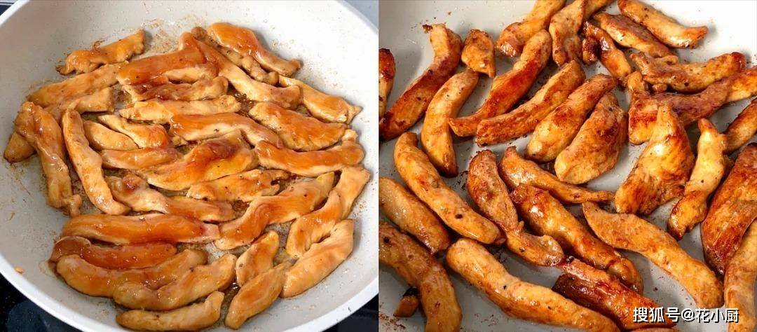 3、这时候,鸡胸肉也腌制得差不多了。咱们在锅底刷一层薄薄的油,把腌制好的鸡胸肉条放进锅里煎。煎的时候要时不时地翻翻面,让鸡肉条两面都能煎到,煎到表面金黄,鸡肉熟透就可以盛出来啦。