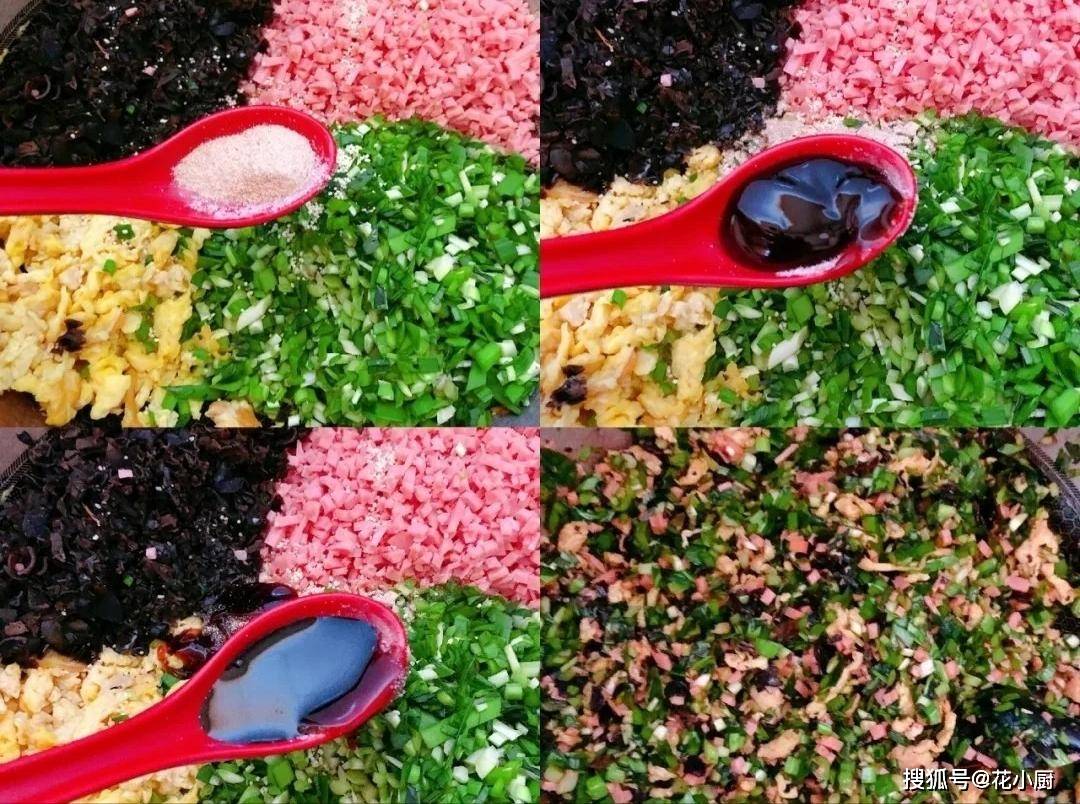 馅料:韭菜、木耳、鸡蛋、火腿、盐、鸡精、蚝油、生抽、香油