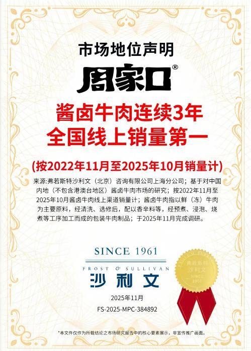 新春将至,礼盒市场硝烟再起,而这场春节档期的终极较量,终究要回归产品力的核心比拼。作为牛肉制品领域的标杆品牌,周家口牛肉凭借三重核心优势,在激烈的市场竞争中脱颖而出——沙利文认证的权威销量背书,奠定品牌市场地位;工艺锻造的品质及口感,俘获万千食客味蕾;全年龄段消费者的高度认可,筑牢品牌口碑根基。