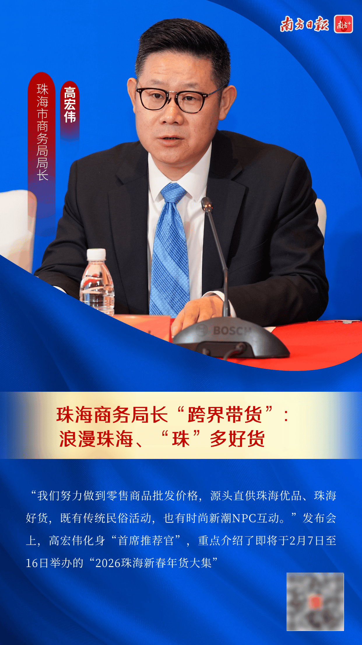 “我们努力做到零售商品批发价格,源头直供珠海优品、珠海好货,既有传统民俗活动,也有时尚新潮NPC互动。”发布会上,高宏伟化身“首席推荐官”,重点介绍了即将于2月7日至16日举办的“2026珠海新春年货大集”,并向广大市民、游客以及港澳同胞发出诚挚邀请。