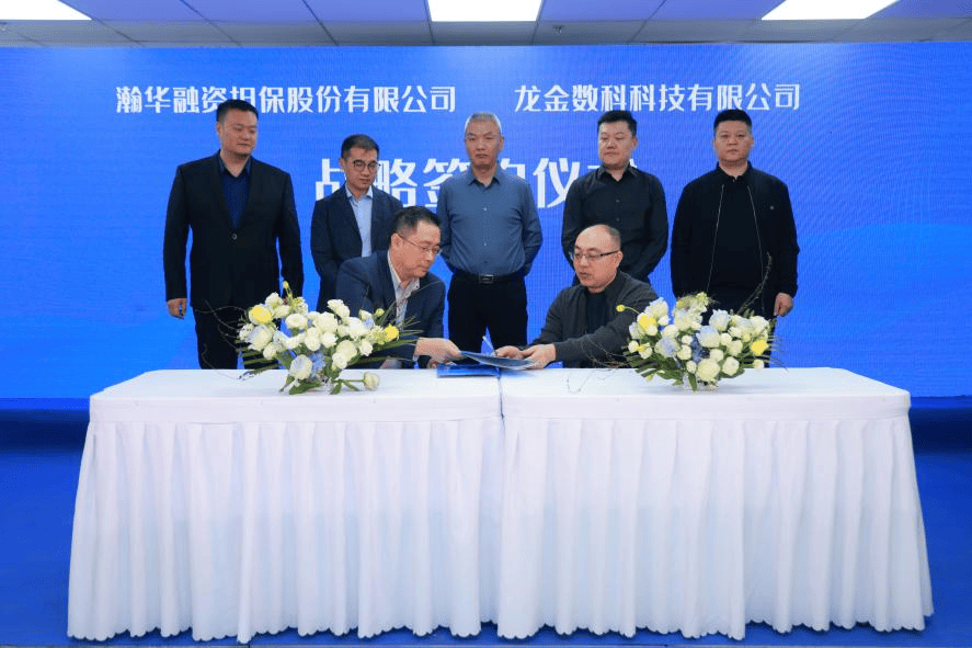 图片说明:龙金数科副总裁吝建国与瀚华金控副总裁、瀚华担保董事长、总裁季春江代表双方签约,共建业务风控协同机制。