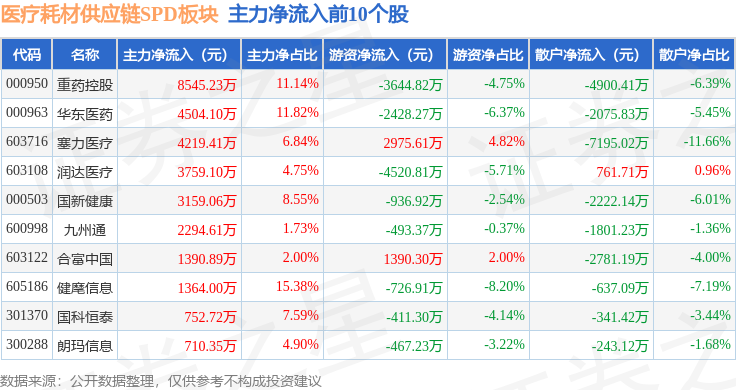 从资金流向上来看,当日医疗耗材供应链SPD板块主力资金净流入2.44亿元,游资资金净流出9297.29万元,散户资金净流出1.51亿元。医疗耗材供应链SPD板块个股资金流向见下表: