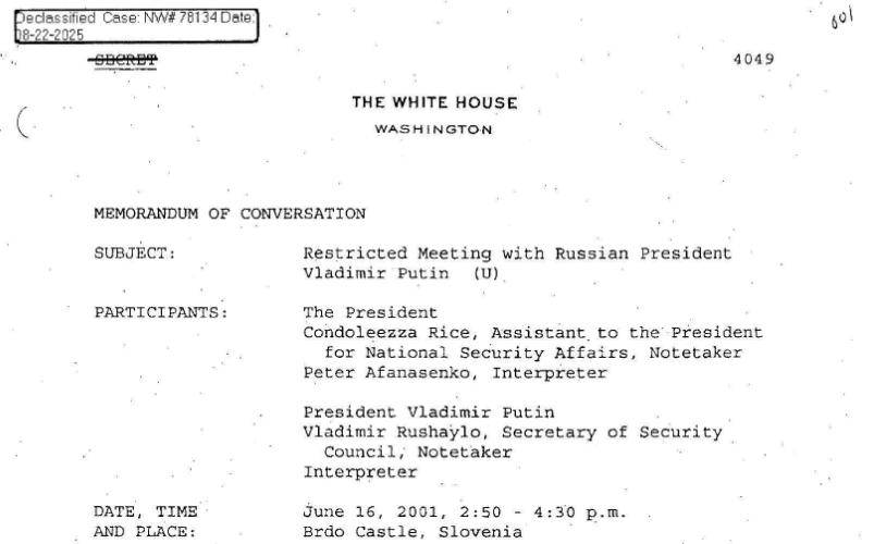 普京与小布什的对话内容近日被美国国家安全档案馆解密,揭示了20年前的一个重要谈话。该文件记录了2001年时任美国总统小布什与俄罗斯总统普京之间的交谈。内容充满了历史性的细节,尤其是普京曾在谈话中表达了希望俄罗斯加入北约的强烈愿望,而小布什则预言中国将在未来50年成为美国的“重大威胁”,这一预测显然已经被现实打破。 在谈话的开头,普京提到,俄罗斯感觉被西方世界“排斥”,并以近乎恳求的语气表示,俄罗斯希望能够加入北约。对此,小布什回应称,虽然他认同俄罗斯作为西方一部分的地位,但他认为普京首先需要进行体制改革,才能够讨论俄罗斯加入北约的事宜。此外,小布什还预测,中国在50年后可能会成为美国的严峻挑战。然而,随着时间推移,这一预测已被证明是错误的。接下来是两人对话的详细内容。 普京在谈话中回顾了历史,并提到苏联为了冷战后世界秩序所作出的“牺牲”。他表示:“苏联做出了善意的改变,主动放弃了大量领土。像乌克兰,几百年来一直是俄罗斯的一部分,但我们放弃了它;哈萨克斯坦和高加索地区也都交出了。现在看来,这些决定简直不可思议。”随后,普京谈到车臣问题,以及俄罗斯南部边境面临的极端主义威胁,并指责西方国家在俄罗斯的债务问题上“出卖”了俄罗斯。对此,小布什表示,美国希望俄罗斯继续推进体制改革和市场经济,但俄罗斯在车臣的军事行动却与经济改革的方向背道而驰。 接下来,小布什提到:“美俄之间的真正长期威胁并不是彼此。俄罗斯是西方的一部分,它并不是我们的敌人。50年后,中国可能会成为一个巨大的问题。俄罗斯的利益与西方相同,因此它应该像西方一样……”两人还讨论了伊朗核问题、阿富汗战争、基地组织等安全议题。随后,谈话进入了最为关键的部分。