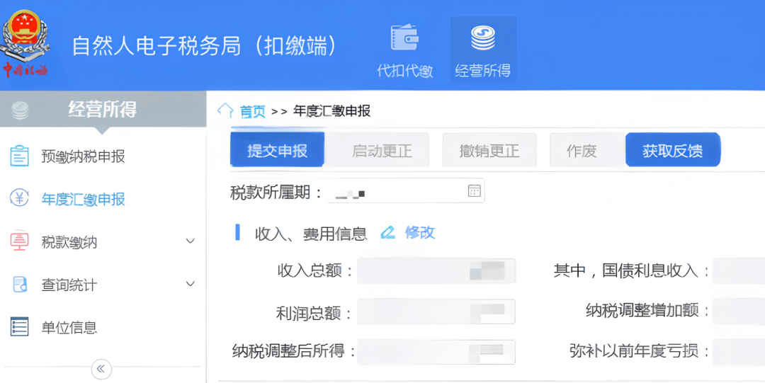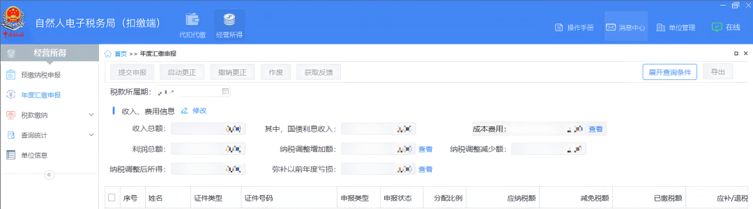 二、点击【经营所得】-【年度汇缴申报】-【修改】,根据实际情况填写收入总额、成本费用、纳税调整额和弥补以前年度亏损等明细数据,填写完毕点击【确定】-【提交申报】。