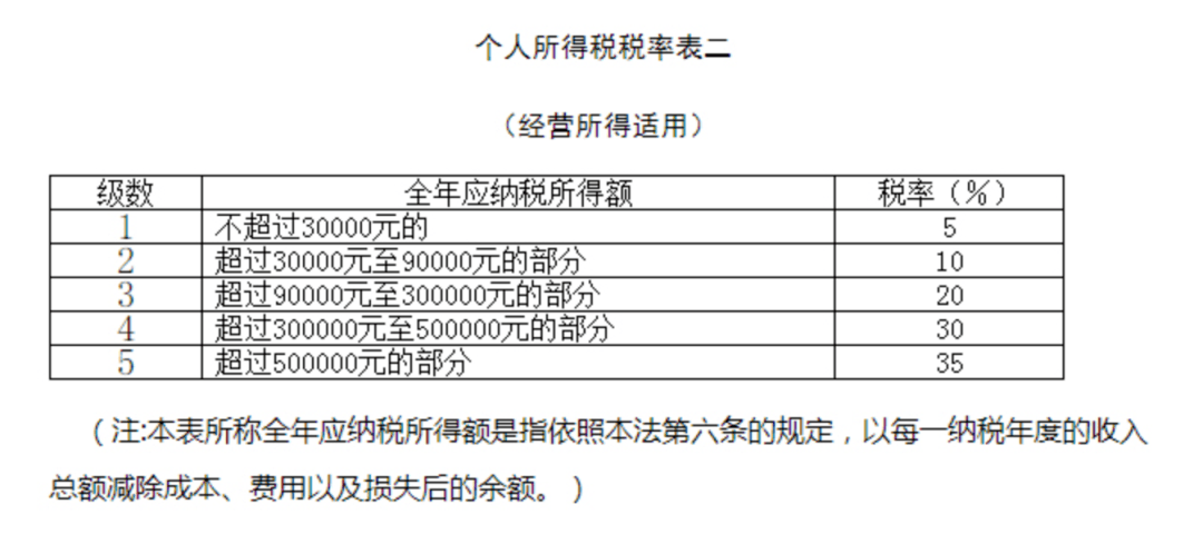 根据《中华人民共和国个人所得税法》第三条及第六条,经营所得,以每一纳税年度的收入总额减除成本、费用以及损失后的余额,为应纳税所得额,适用百分之五至百分之三十五的超额累进税率。