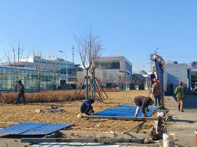 施工人员正在拆除望京西交通枢纽周边的围挡。