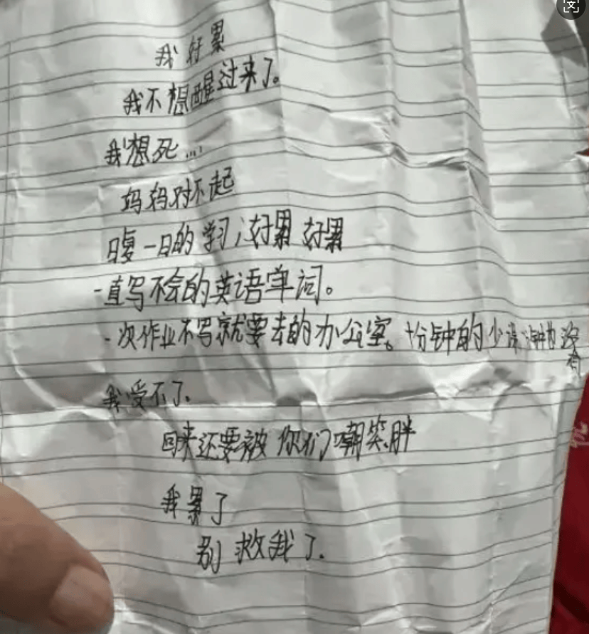最近消息,江苏12岁女孩因完成不了英语作业留下遗书:“我好累,我不想醒过来了。我想死,妈妈对不起,日复一日的学习,好累好累,一直不会写的英语单词。一次作业不写就要去的办公室……我受不了,回来还要被你们嘲笑胖,我累了,别救我了。”当外婆发现她时,孩子已面朝下趴在地上,身旁是空空如也的药瓶——整整100粒心脏病药物,彻底夺走了这个刚过完农历生日的六年级学生的生命。