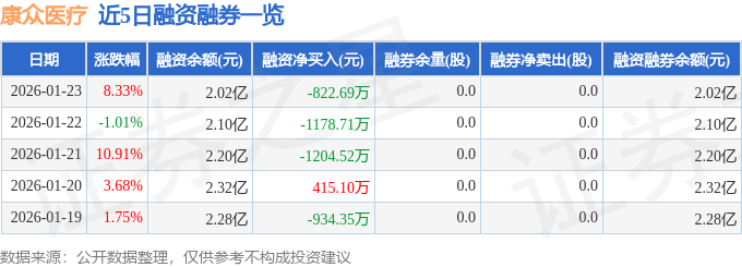 康众医疗融资融券信息显示,融资方面,当日融资买入2793.34万元,融资偿还3616.03万元,融资净偿还822.69万元。融券方面,融券卖出0.0股,融券偿还0.0股,融券余量0.0股,融券余额0.0万元。融资融券余额2.02亿元。