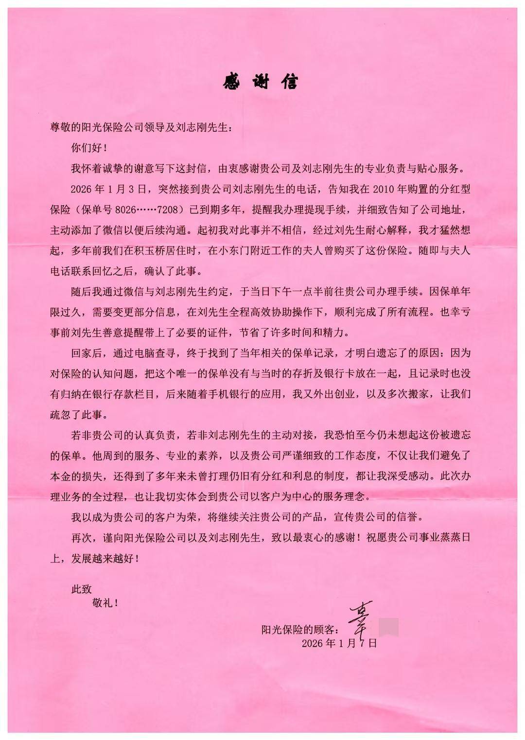 近日,阳光人寿湖北分公司客户服务经理刘志刚收到客户辜先生寄来的感谢信,感谢其主动提醒并协助办理一份被遗忘16年的保单满期领取手续。这份险些被尘封的保单,在工作人员的主动排查与协助下,让客户顺利挽回了应得权益。