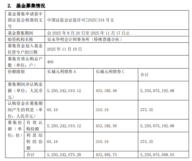募集期间净认购金额5,250,675,192.68元,认购资金在募集期间产生的利息375.35元,募集份额合计5,250,675,568.03份。