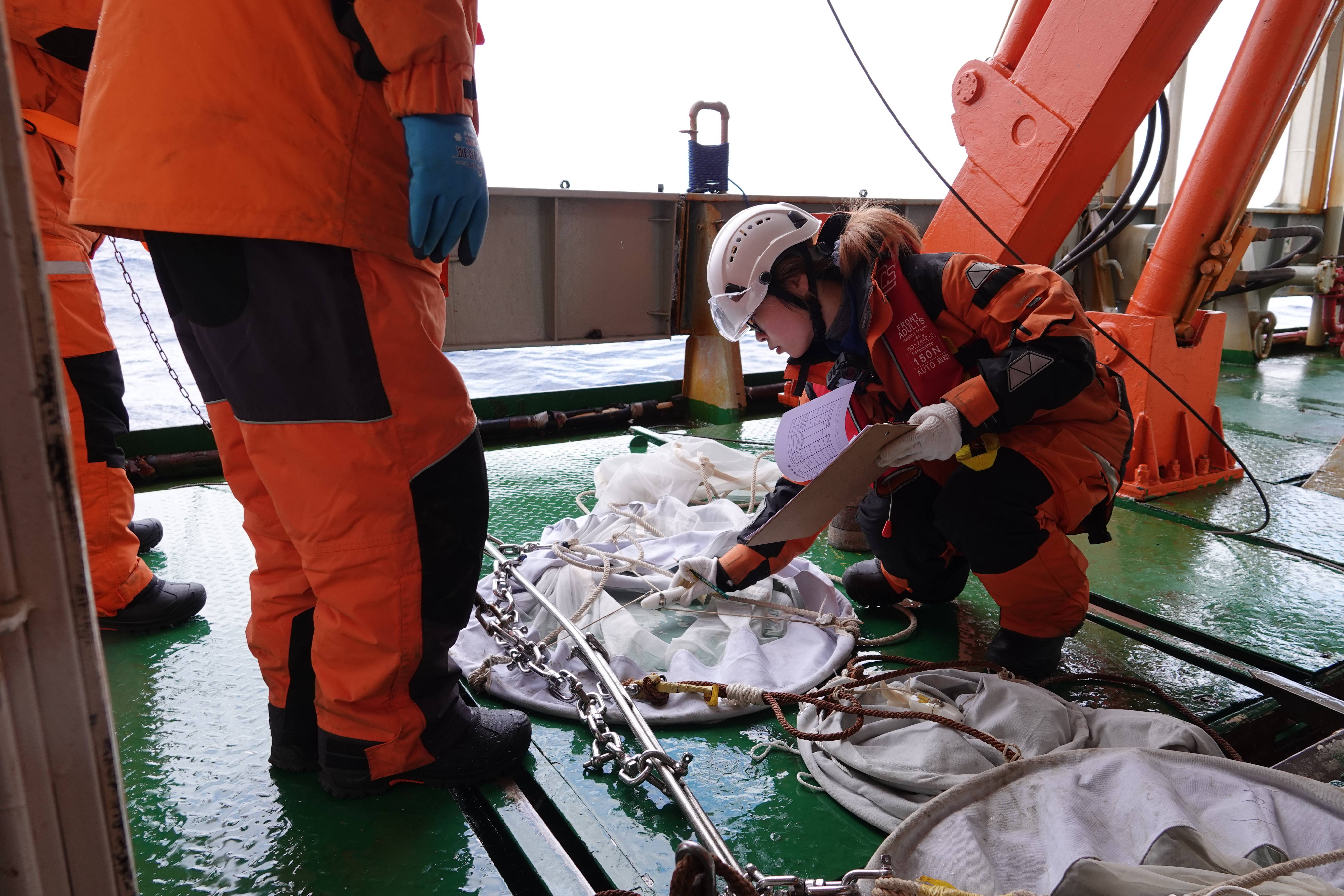 北京时间1月24日,“雪龙”号大洋队队员阮亦琳在舯部甲板准备布放垂直生物拖网。 新华社记者 顾天成 摄