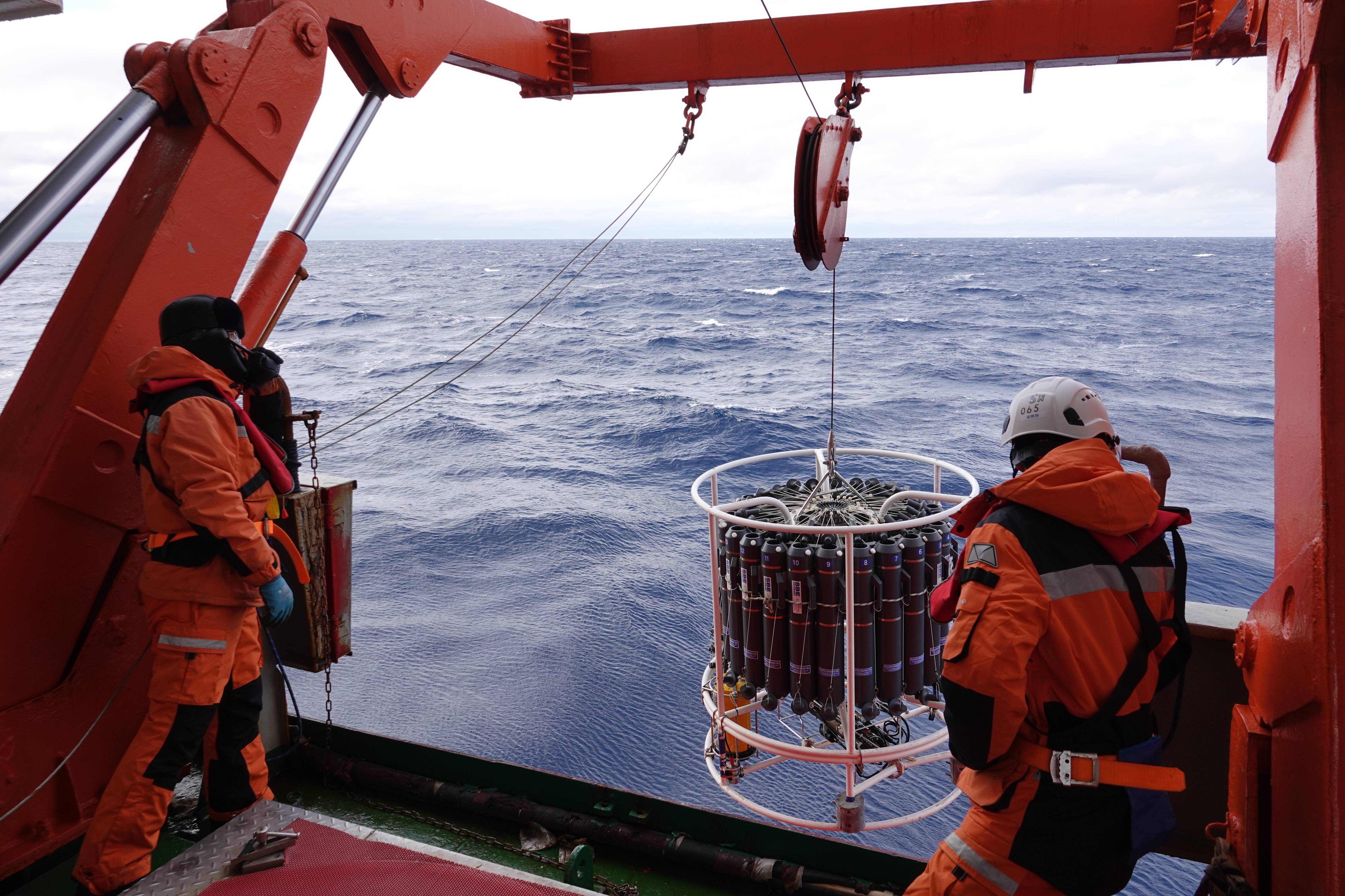北京时间1月24日,“雪龙”号大洋队队员丁伟康(左)和宋熙存在舯部甲板开展本次考察阿蒙森海区域首次温盐深剖面观测和海水样品采集作业。 新华社记者 顾天成 摄