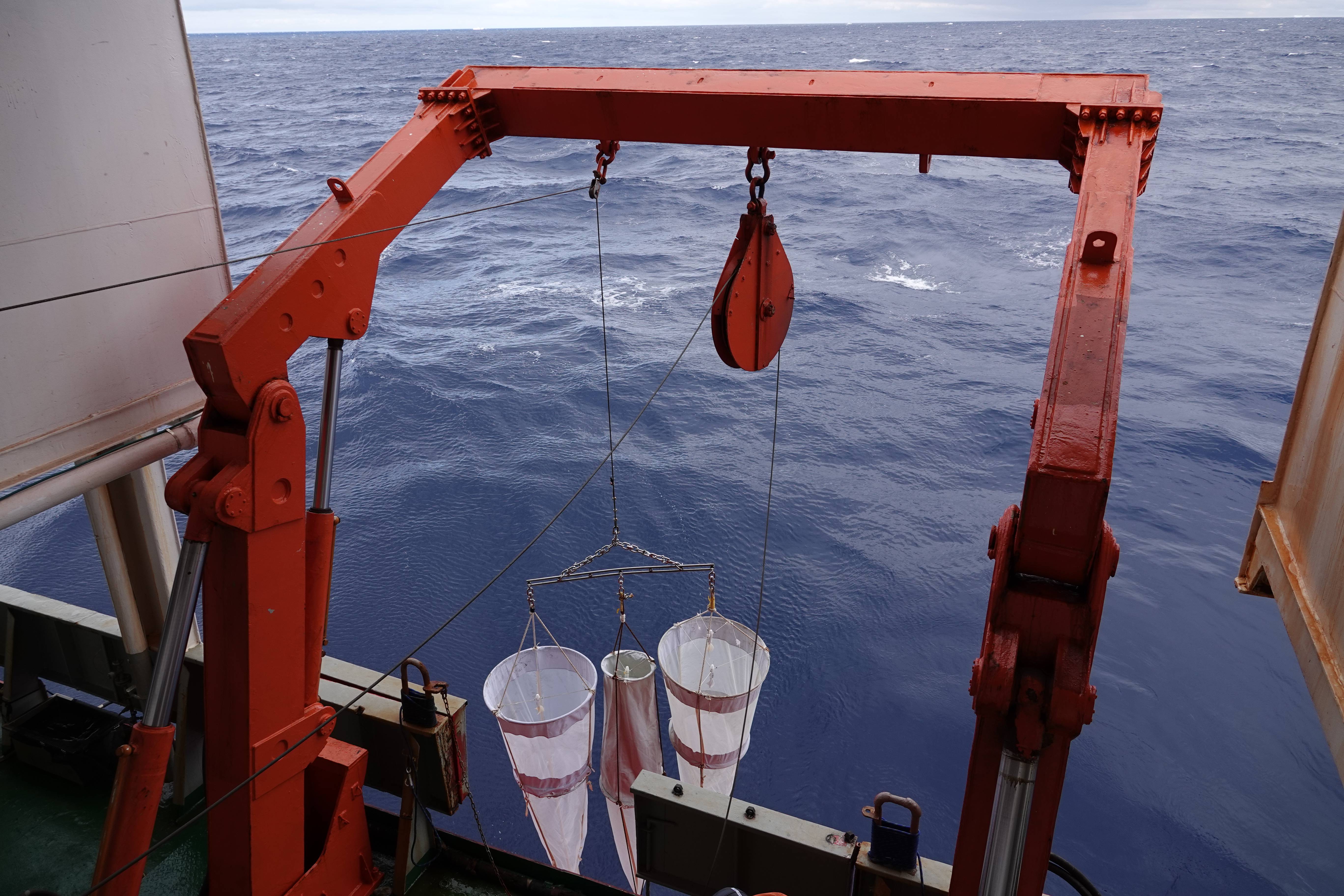 北京时间1月24日,“雪龙”号舯部甲板上,垂直生物拖网正在被回收。 新华社记者 顾天成 摄