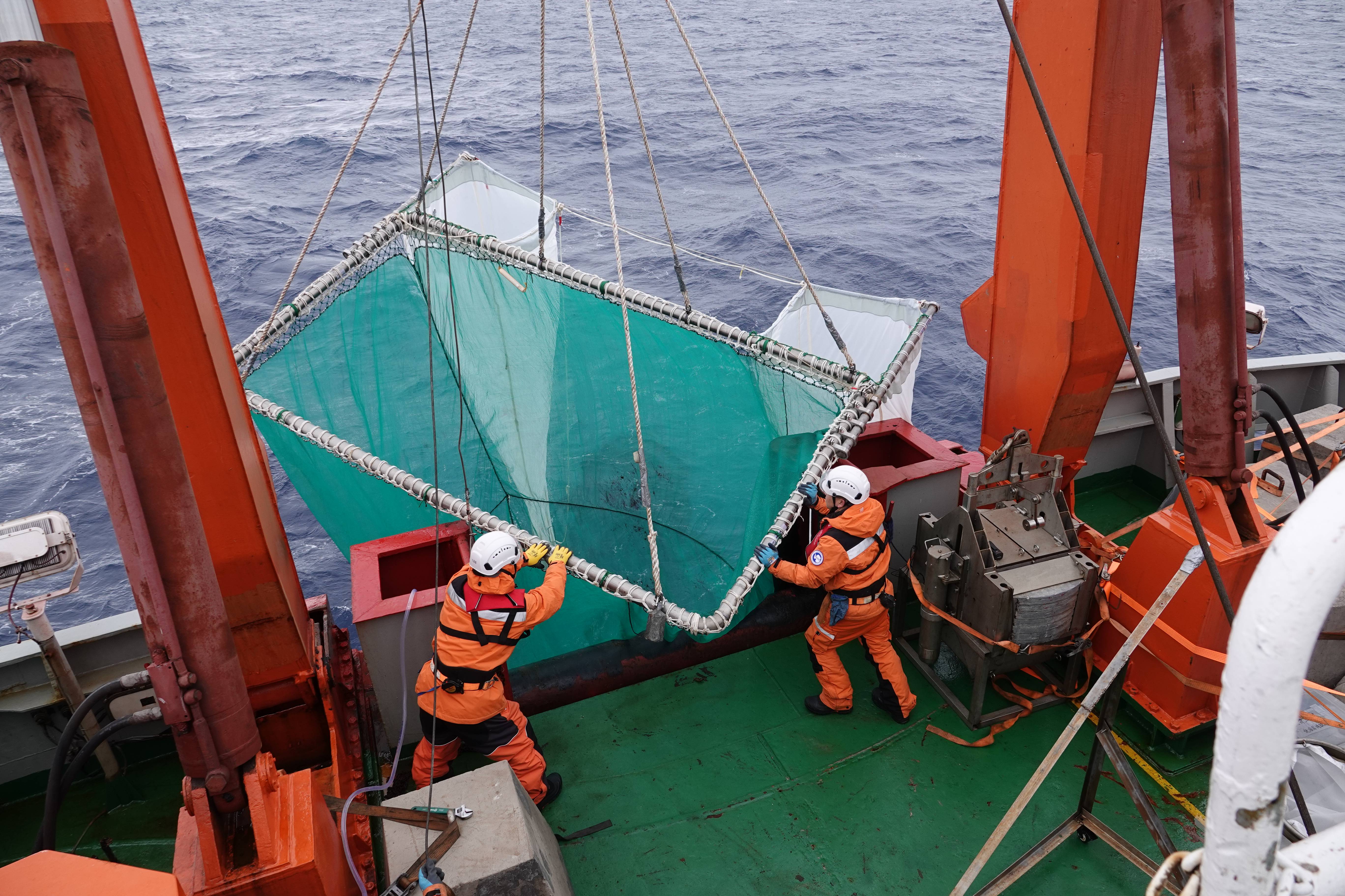北京时间1月24日,“雪龙”号大洋队队员李帅(右)和陈艺煌在艉部甲板开展本航次首个磷虾拖网作业。 新华社记者 顾天成 摄