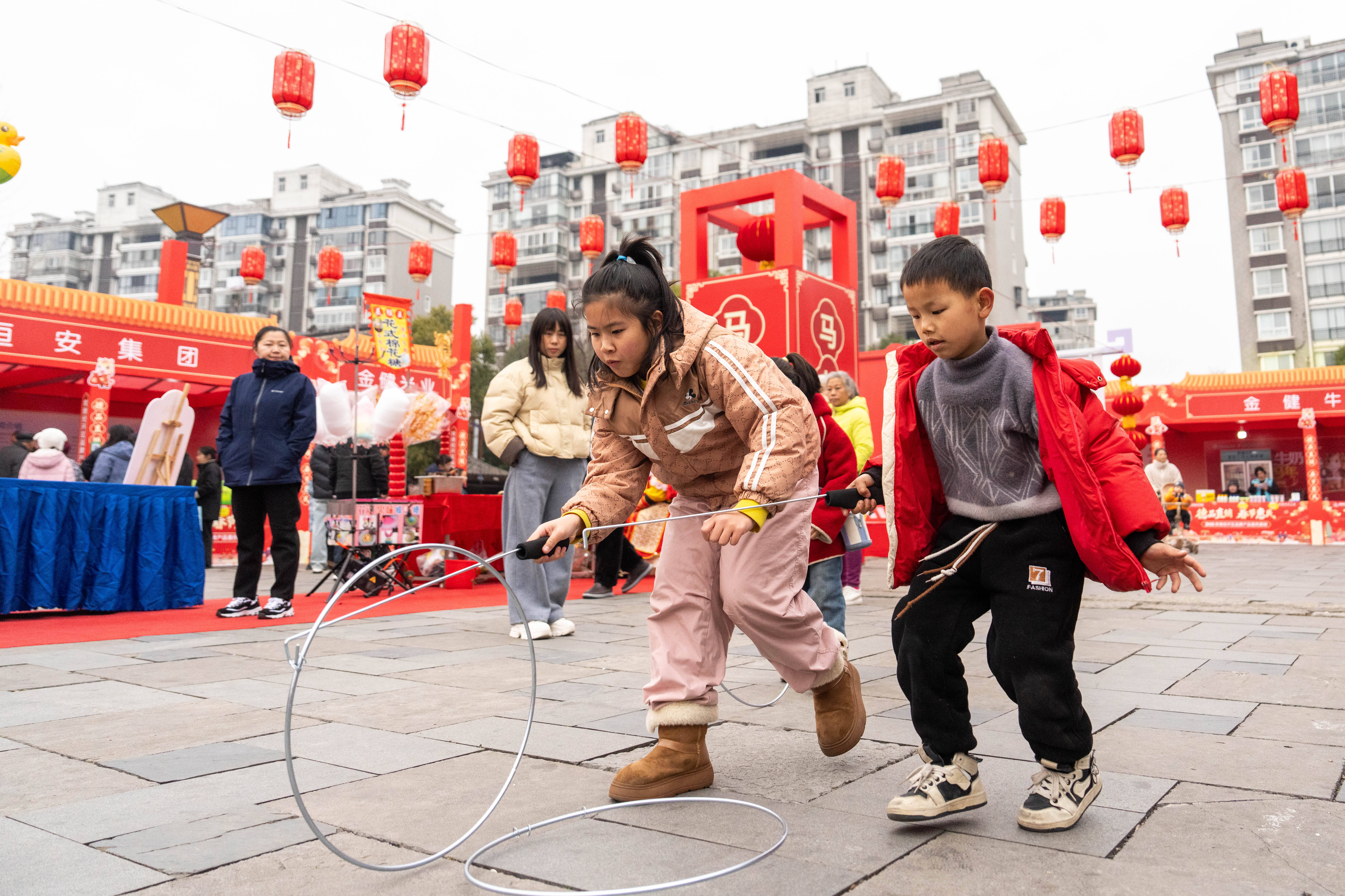 1月24日,在常德河街春秋广场,小朋友在活动现场体验滚铁环游戏。 新华社记者 陈思汗 摄