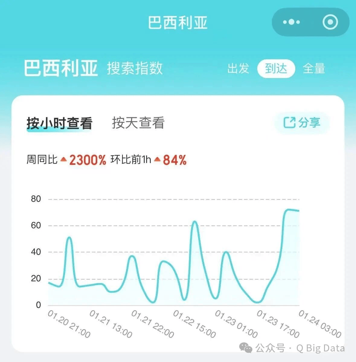 截至1月24日上午9时,国内飞往巴西利亚的搜索量一小时激增84%。