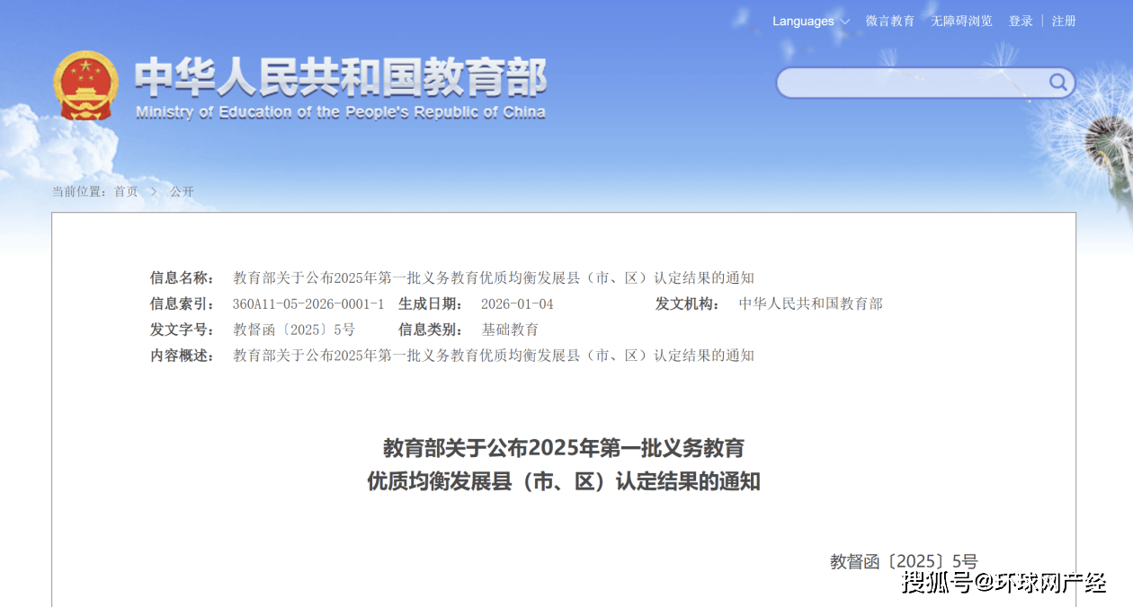 【环球网报道 记者 陈全】记者1月14日从教育部了解到,按照《中华人民共和国义务教育法》以及《县域义务教育优质均衡发展督导评估办法》《县域义务教育优质均衡发展国家督导评估认定工作规程》等规定,经组织开展资格审查、质量监测、社会认可度调查、指标审核和集中汇审等国家督导评估认定程序,教育部决定认定北京市石景山区等326个县(市、区)为2025年第一批义务教育优质均衡发展县。