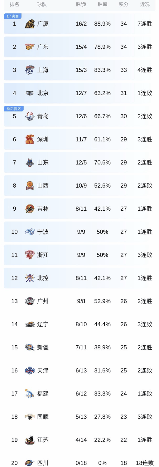 CBA积分榜更新,广厦跟广东同为34分,排名前2位,上海33分排第3,北京队逐渐远离第一梯队。