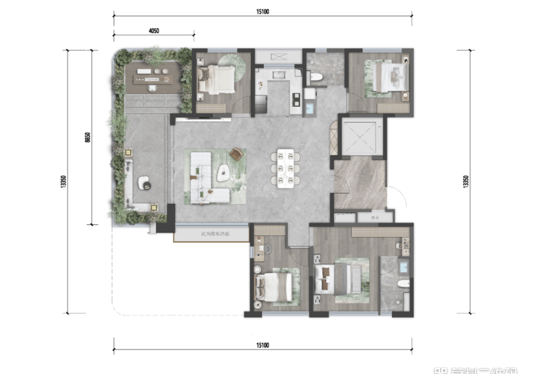 改善型四房设计,约27-34㎡观景露台,约5㎡私享入户前厅,约111-119%实享空间。居项目楼尊,尽揽高定中庭景观,尊享臻贵景观资源