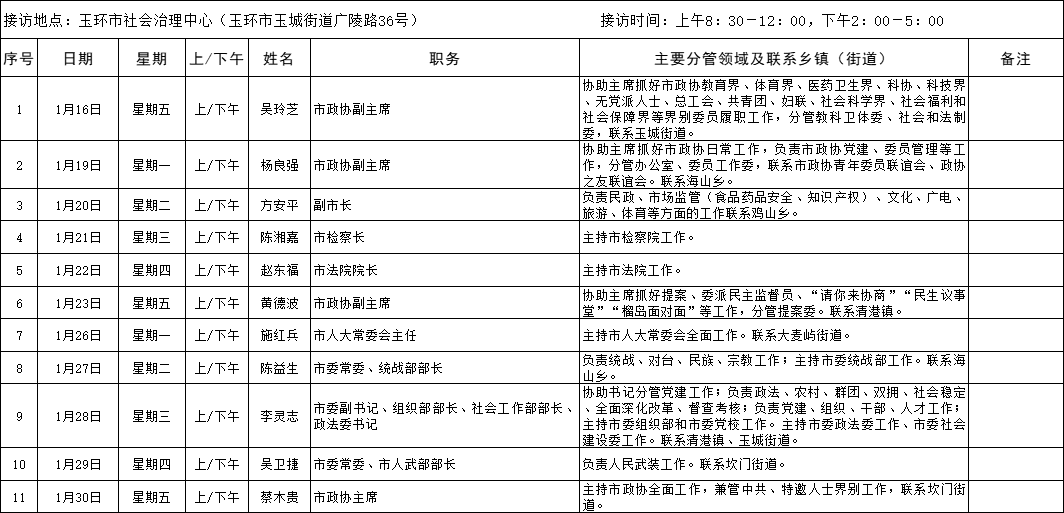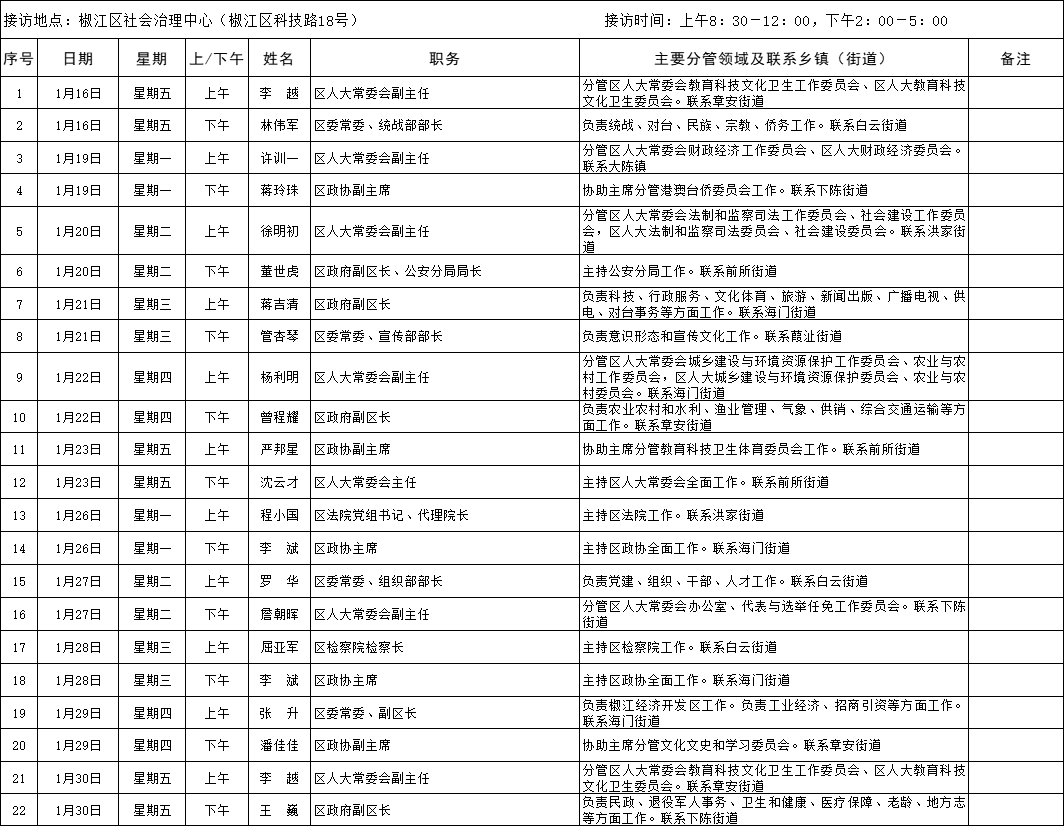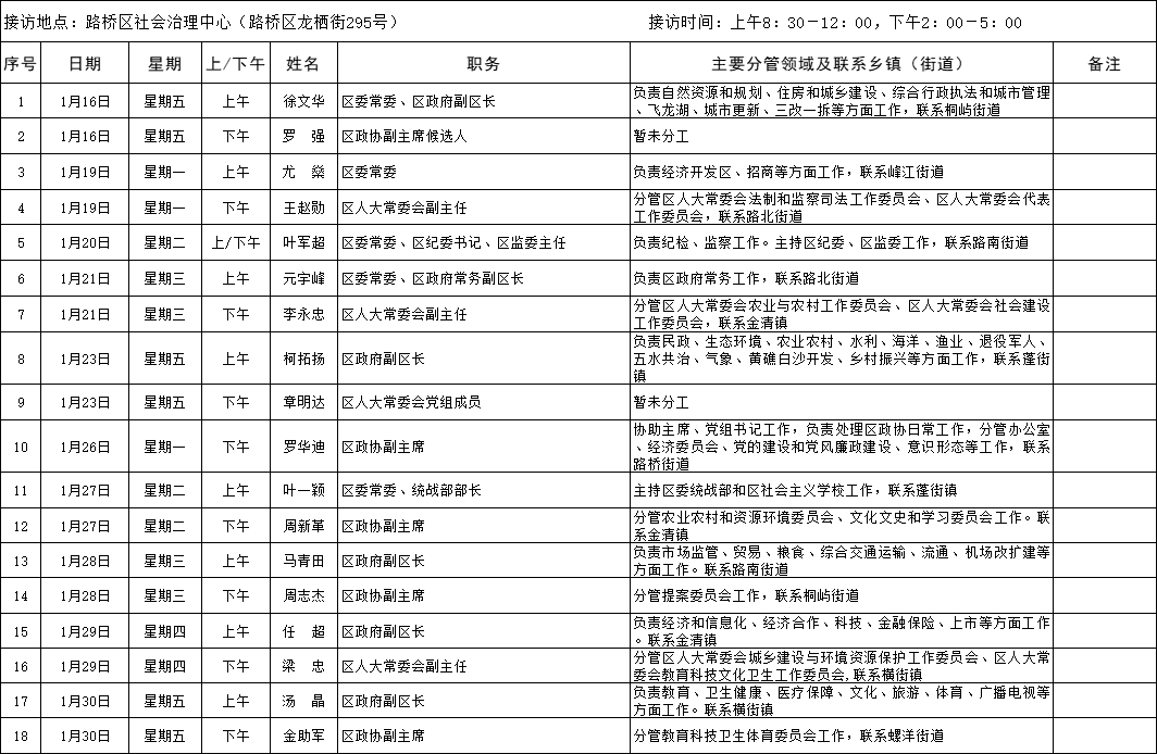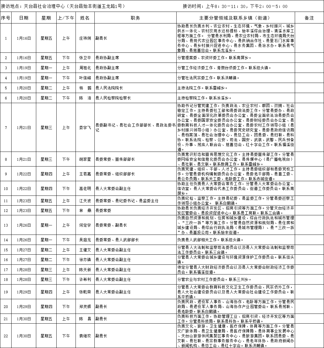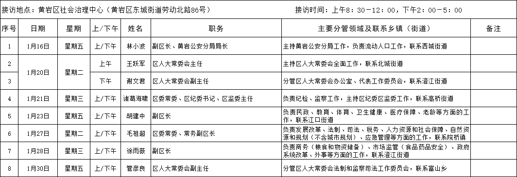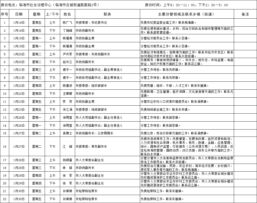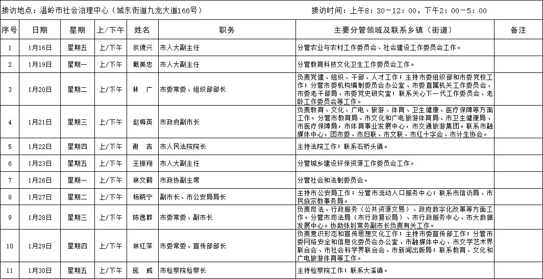 为进一步强化和规范县级领导干部定期公开接访群众工作,依法、及时、就地解决群众合理诉求,实现人民信访“最多跑一次”的目标,根据省信访工作领导小组《关于印发<浙江省县级领导干部公开接待群众来访工作办法>的通知》(浙信领[2020]6号)、省信访工作领导小组办公室《关于加强县级领导值守接访工作的通知》(浙信领办[2018]7号)和台市委办、市府办《关于印发<台州市关于加强县级领导干部定期公开接访群众工作十条规定>的通知》精神,现将我市各县(市、区)县级领导干部1月16日-1月30日定期公开接访群众安排情况进行公布。