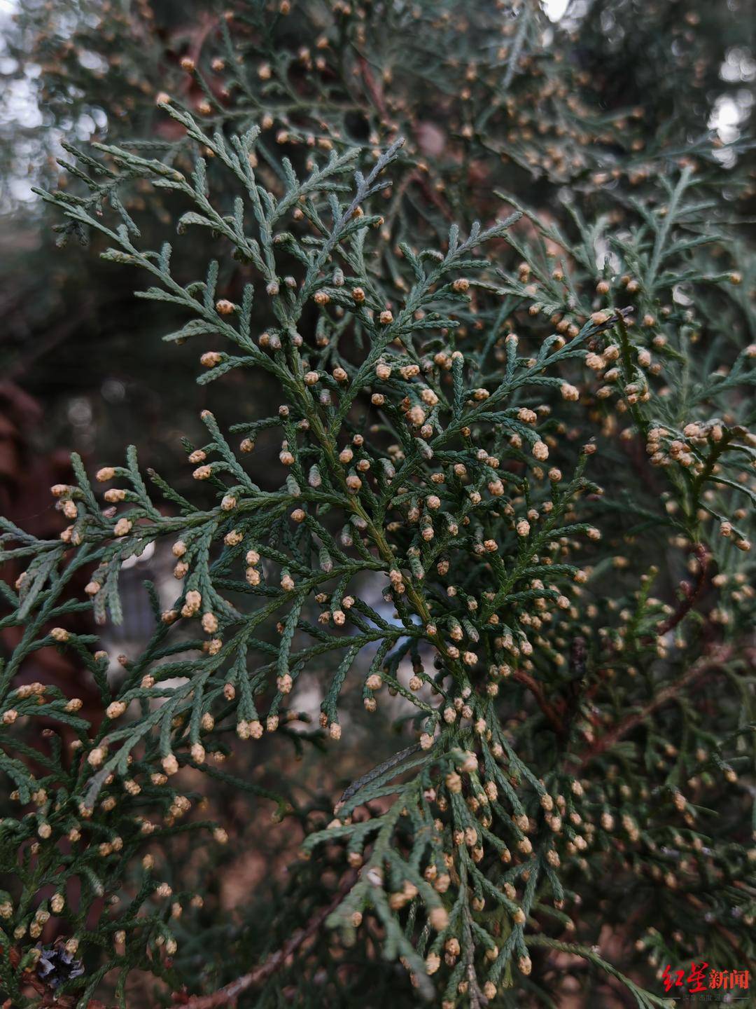 “据我们观测,目前成都主要花粉致敏植物为柏科的侧柏属植物。”李梦霞说。她拍摄的照片显示,侧柏属植物已经开花,“它通过风传播花粉。”