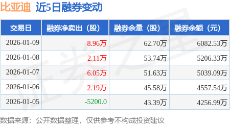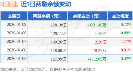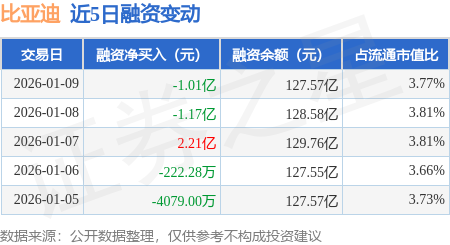 证券之星消息,1月9日,比亚迪(002594)融资买入3.65亿元,融资偿还4.66亿元,融资净卖出1.01亿元,融资余额127.57亿元。