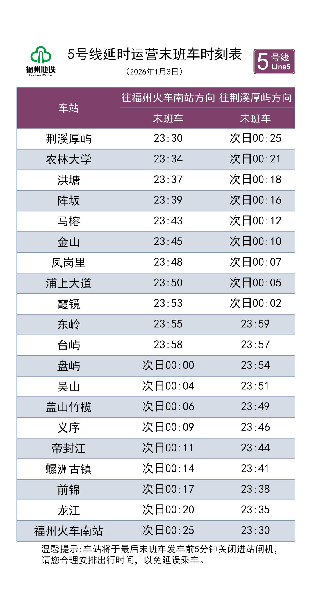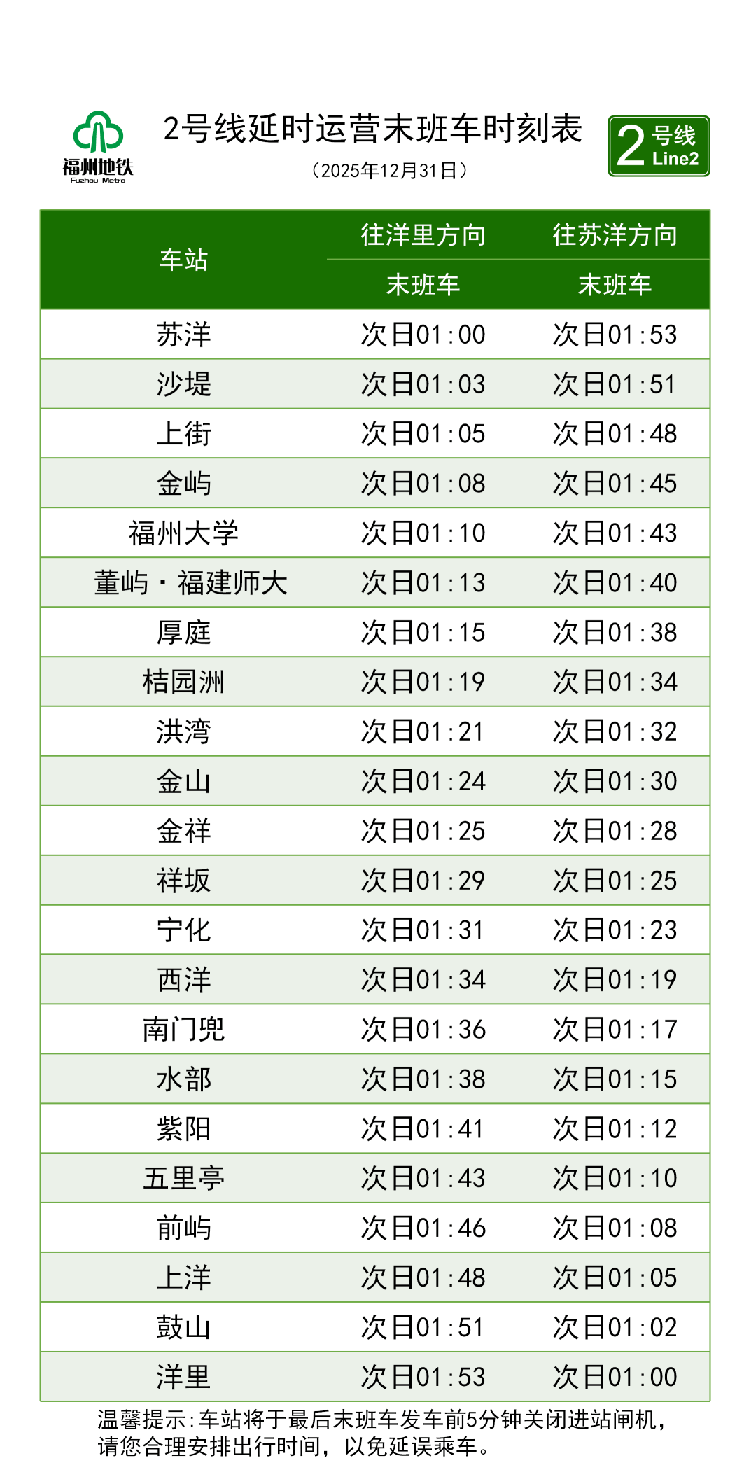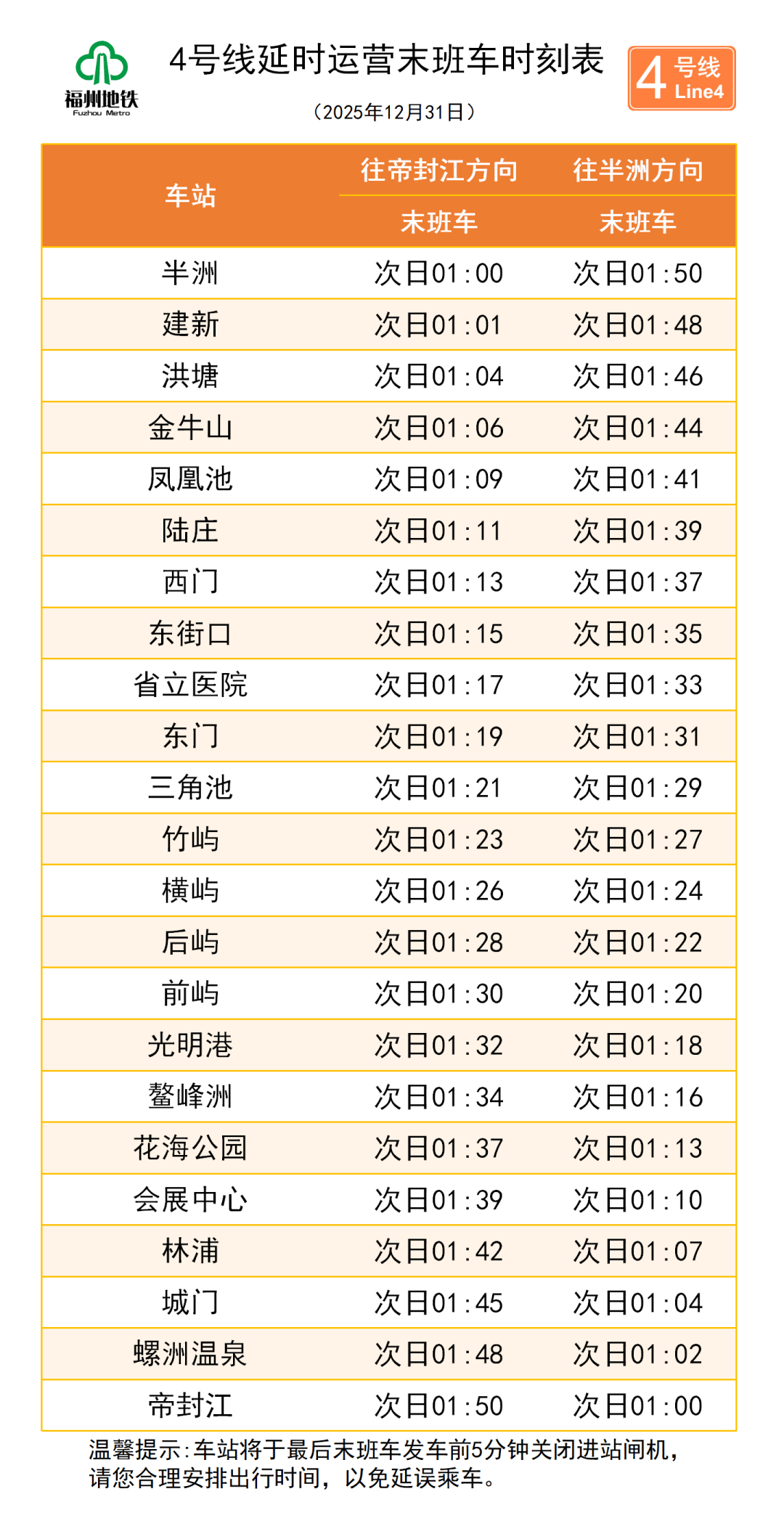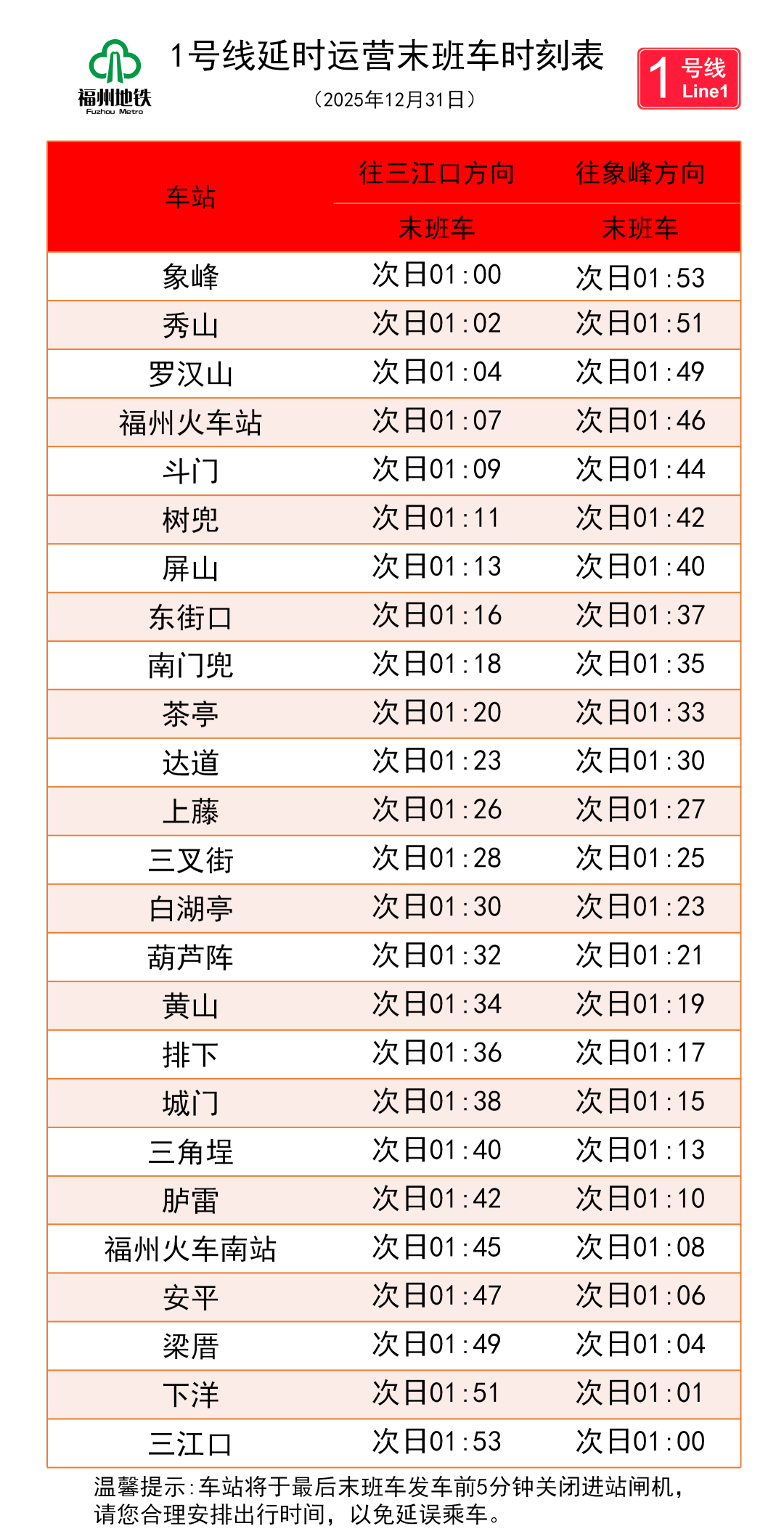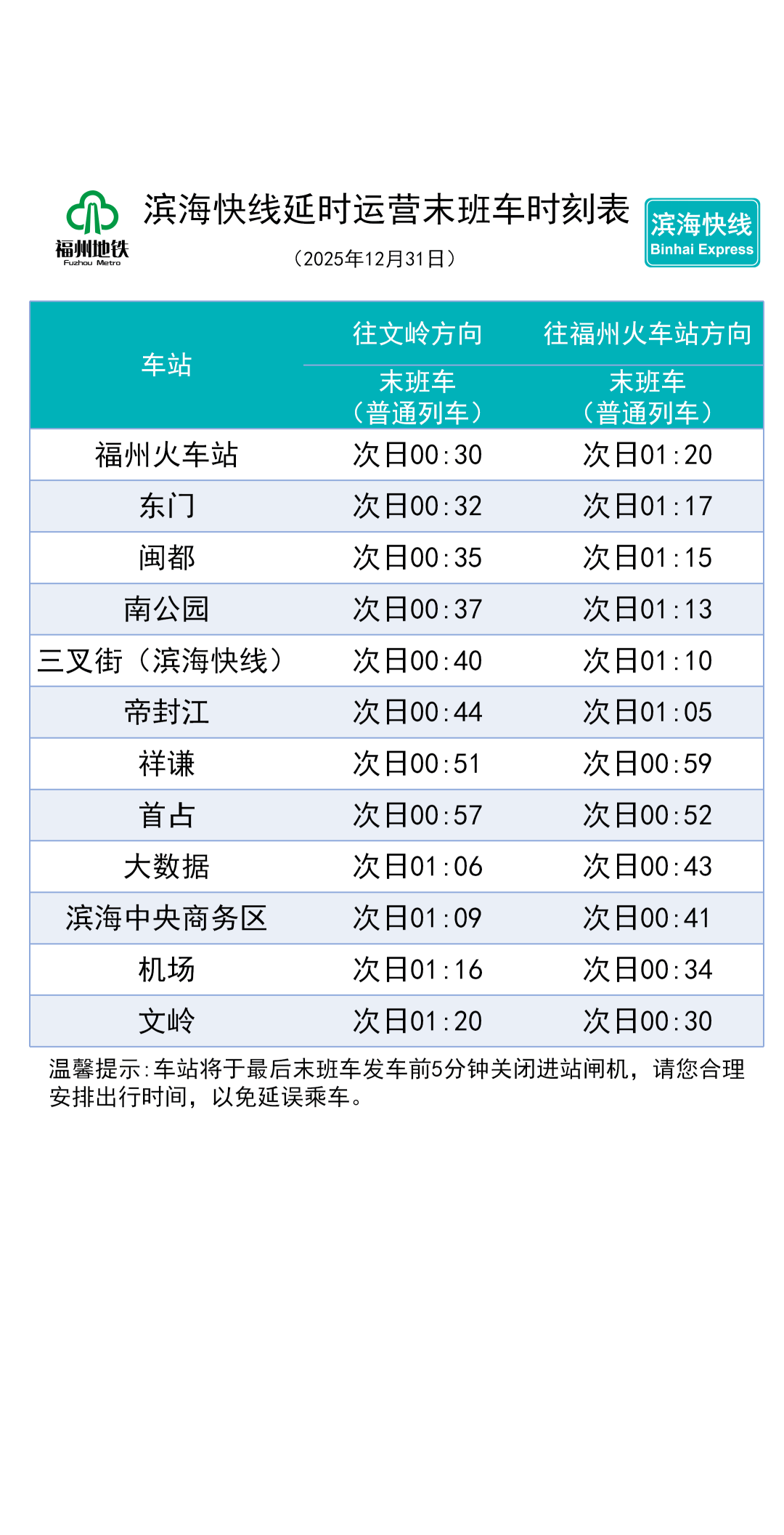 202512311号线、2号线、4号线运营末班车延至次日01:00始发5号线、6号线、滨海快线运营末班车延至次日00:30始发。延时运营期间,1号线、2号线、4号线行车间隔为6505号线、6号线行车间隔为750;滨海快线开行普通列车,行车间隔为7分30秒。