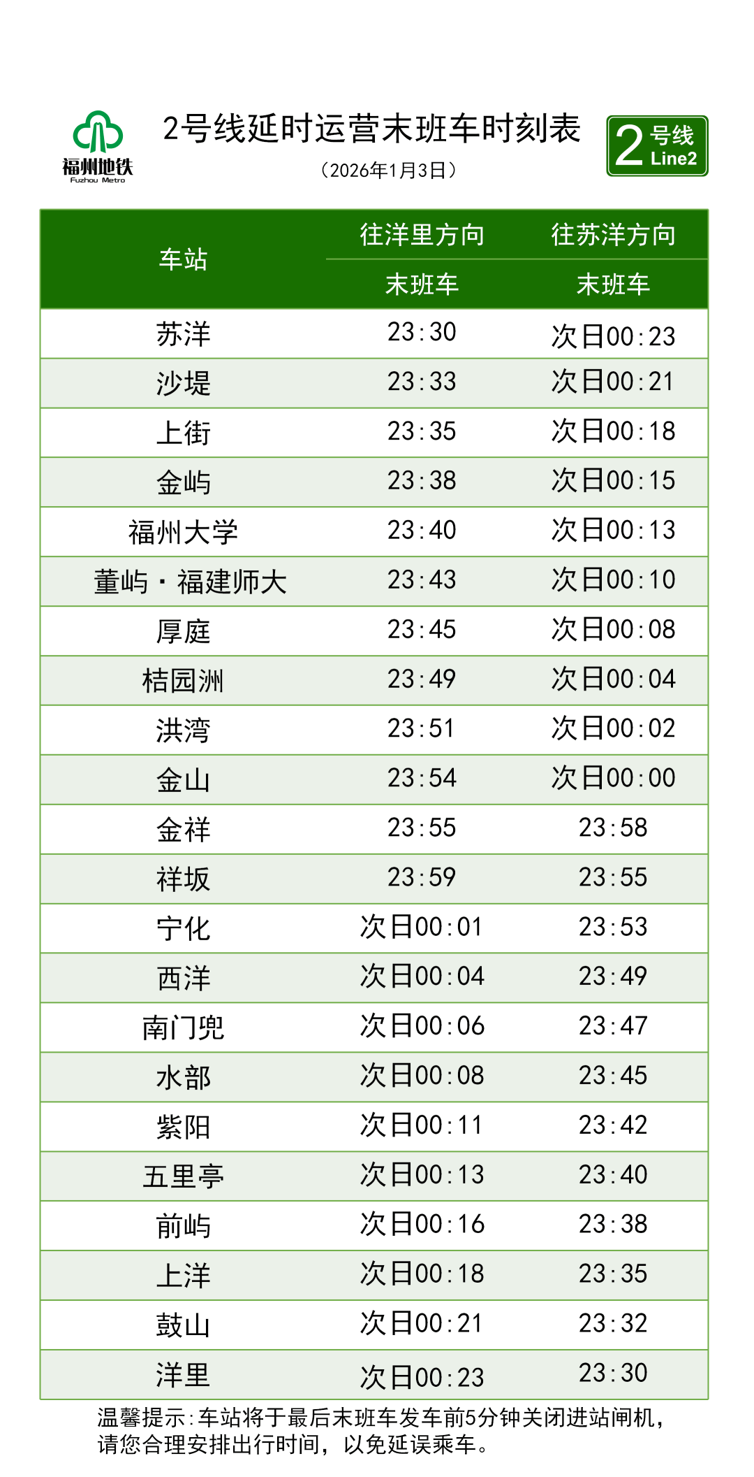 2026131号线、2号线、4号线、5号线、6号线、滨海快线运营末班车延至23:30始发。延时运营期间,各线路行车间隔为15分钟202611日、2日运营时间保持不变。
