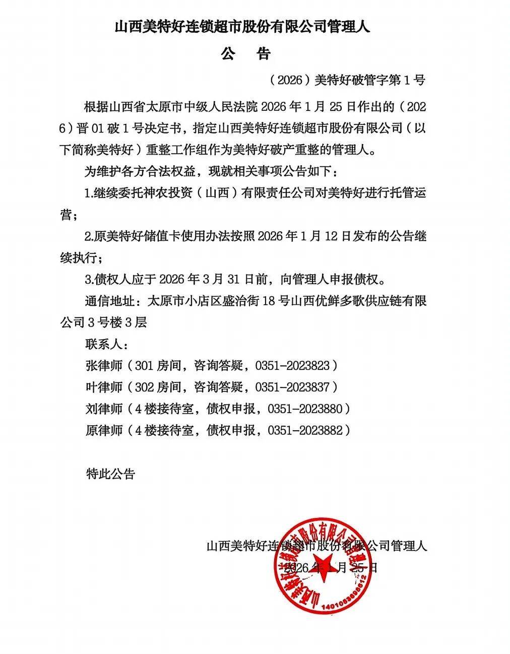 根据山西省太原市中级人民法院2026年1月25日作出的(2026)晋01破1号决定书,指定山西美特好连锁超市股份有限公司(以下简称美特好)重整工作组作为美特好破产重整的管理人。