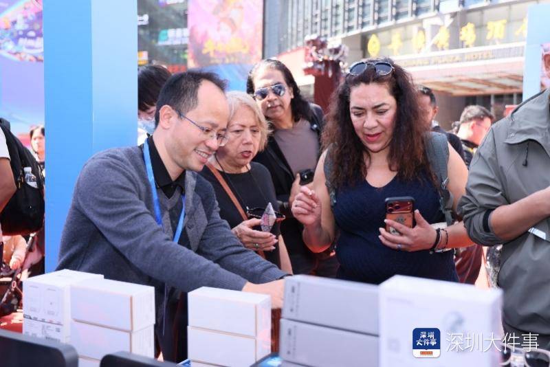 现场熙攘的人群中,肤色各异的外国客商成为了一道独特的风景线。来自中东、东南亚、欧洲等地的外籍客商熟练地穿梭于各个展位档口试用、询价、下单,一气呵成。身着“橙马甲”的国际志愿服务队伍在现场忙碌穿行,手持AI翻译机提供即时帮助。为外籍客商提供多语种翻译、采购指引和咨询服务,这支由辖区市场工作人员、志愿服务队伍是华强北长期以来面向外籍客商常态化开展服务的缩影。无论是日常采购高峰,还是大型促消费活动期间,“橙马甲”始终活跃在华强北商圈、市场一线。