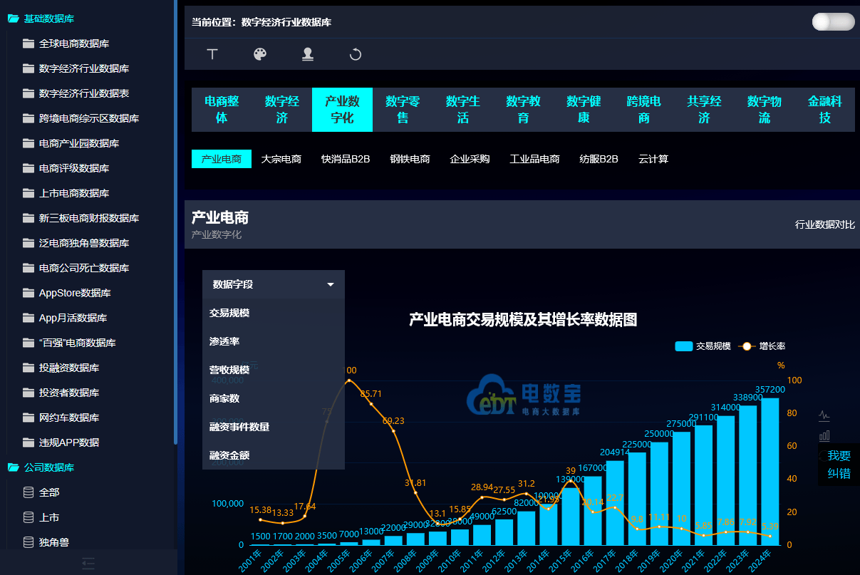 建设有产业电商数据库,覆盖近30年数据,拥有行业、投融资、月活、评级、违规、上市公司财报等数据。