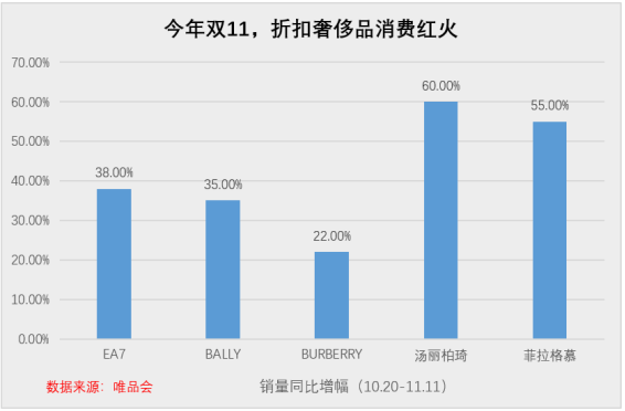 特别是主打品牌特卖的唯品会(VIPS.US),今年1-9月,其奢侈品销售额同比增长就超过了30%。双11期间,多个大牌表现尤为亮眼,其中EA7涨了38%,BALLY涨了35%,Burberry涨了22%,汤丽柏琦更是猛增60%。