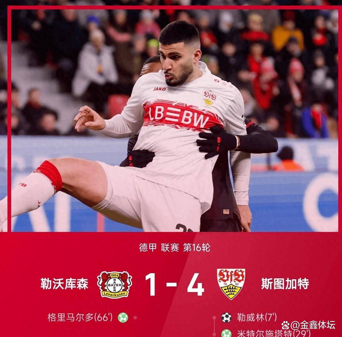 1月11日的拜耳竞技场,在自家球迷震耳欲聋的助威声中,勒沃库森却遭遇了一场意想不到的崩盘。面对阵容严重不整的斯图加特,他们以1-4的比分惨败,主场颜面尽失。