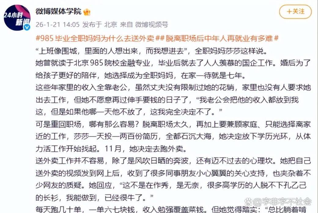 “比起伸手要钱的尴尬,这点辛苦不算什么。” 莎莎说,每送完一单,看到账户里到账的六七块钱,心里都特别踏实。这份收入或许不如从前在国企时的零头,却是她靠自己双手挣来的,不用看人脸色,不用小心翼翼开口求助,这种踏实感,是七年全职妈妈生涯里从未有过的。