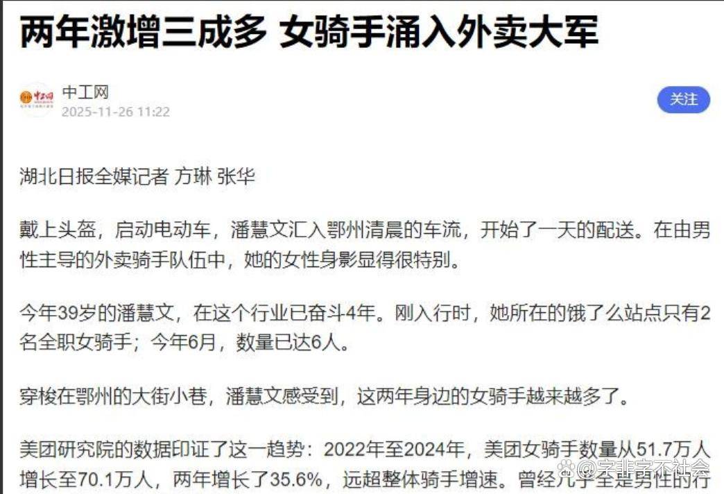 70 万女骑手,背后是 70 万个不同的家庭故事,她们中有人曾是职场精英,有人是普通主妇,有人是单亲妈妈,却都在奔波中找到了属于自己的生存方式。那位 985 金融毕业的宝妈,放下的是过往的光环,拾起的是独立的底气。