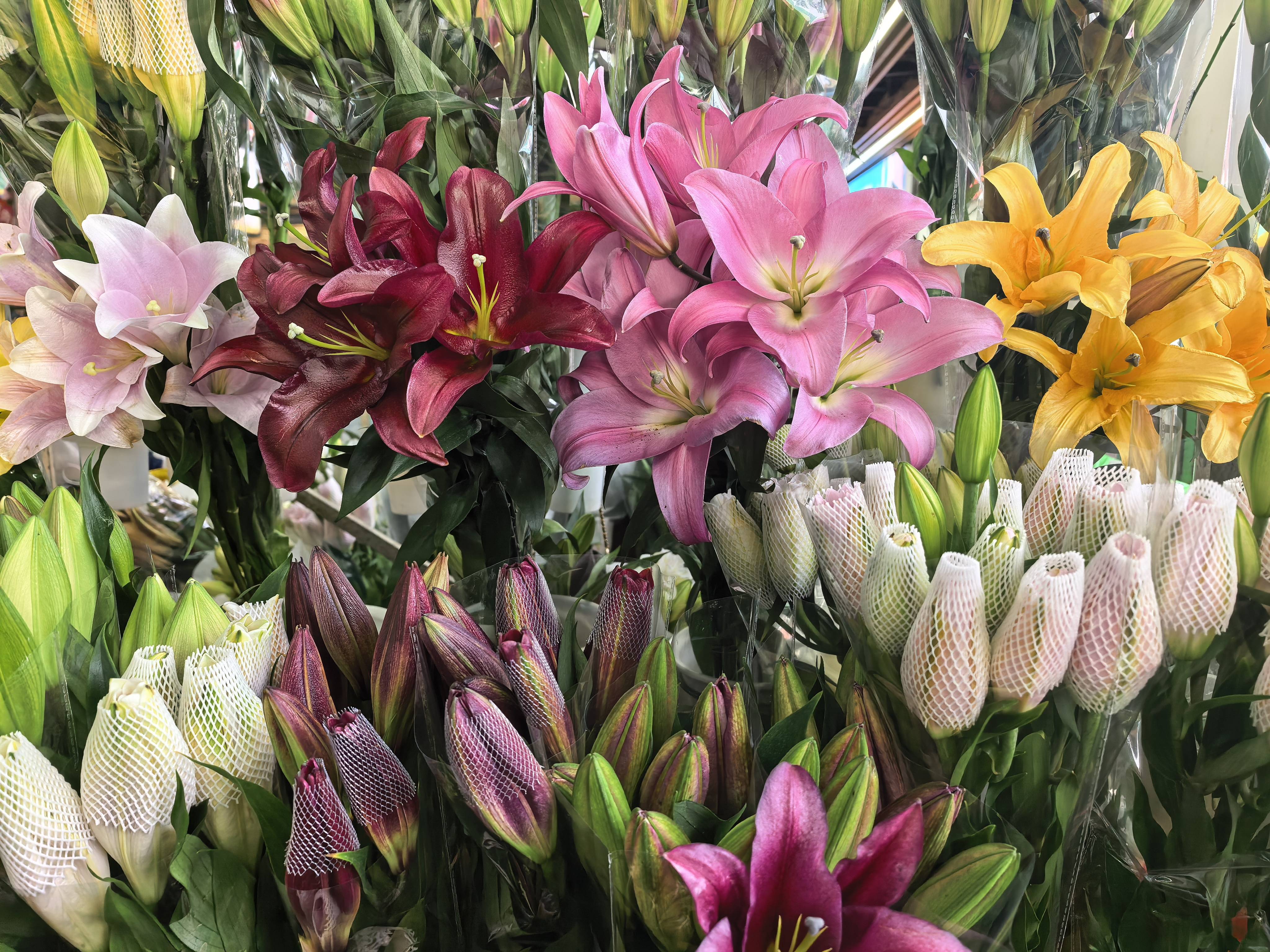 受去年12月寒潮影响,近期上市的百合、玫瑰品质略有下降,价格也随之走低。一位专营百合、玫瑰鲜切花的摊主何先生坦言,前段时间生意较去年同期有所下滑,但随着春节临近,采购人群明显增多,近期每日销售额可达4000多元,市场热度逐步回升。