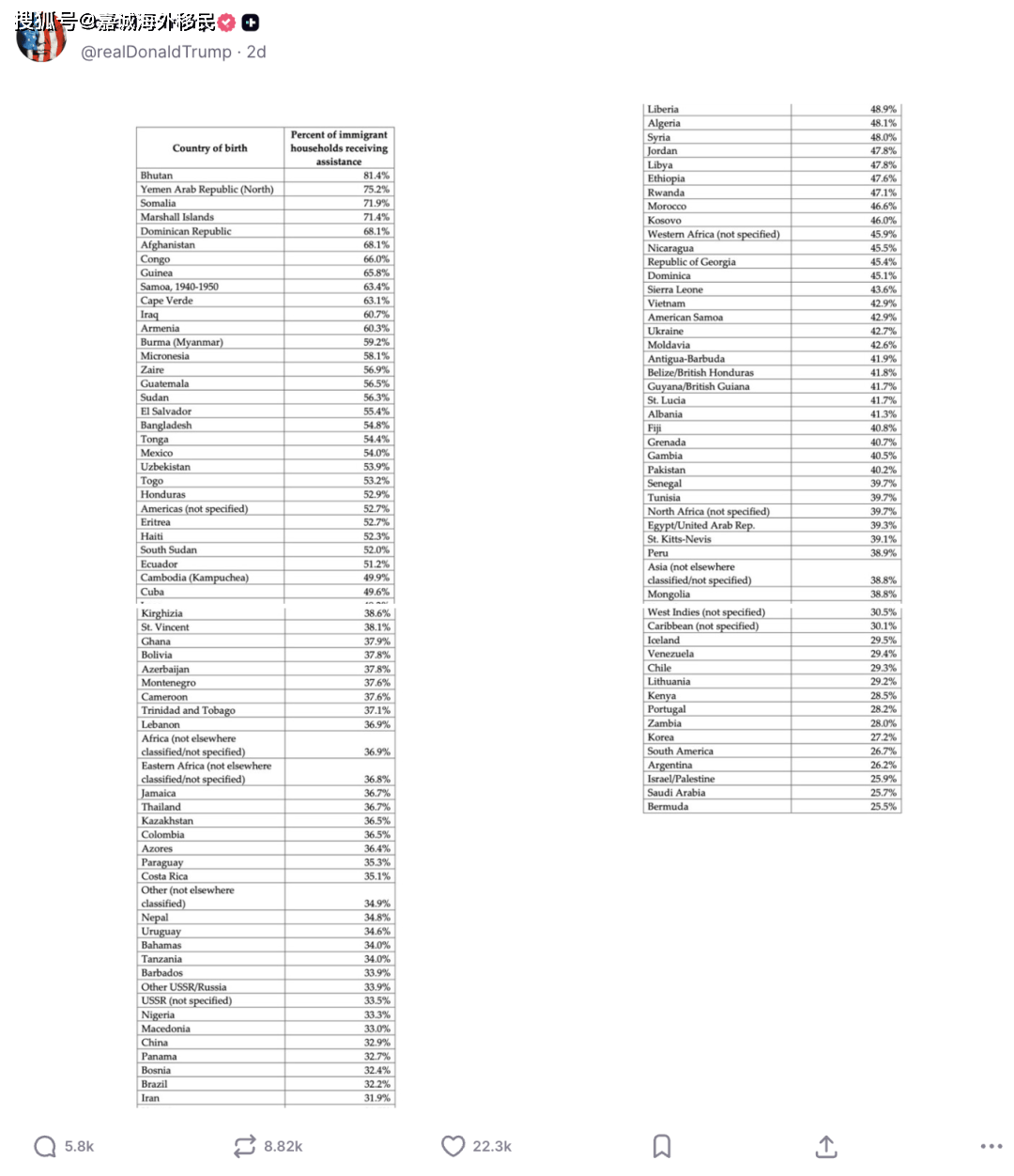 2026年1月4日,川普在社交媒体发布《按原籍国划分的移民福利领取率》图表,公开120个国家移民家庭在美国领取公共福利的比例。