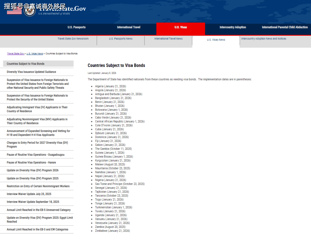 据美国国务院领事司1月6日在国务院官网上公布的最新通知,美国将要求赴美签证申请人须缴纳最高1.5万美元保证金的国家名单扩大至38个国家。