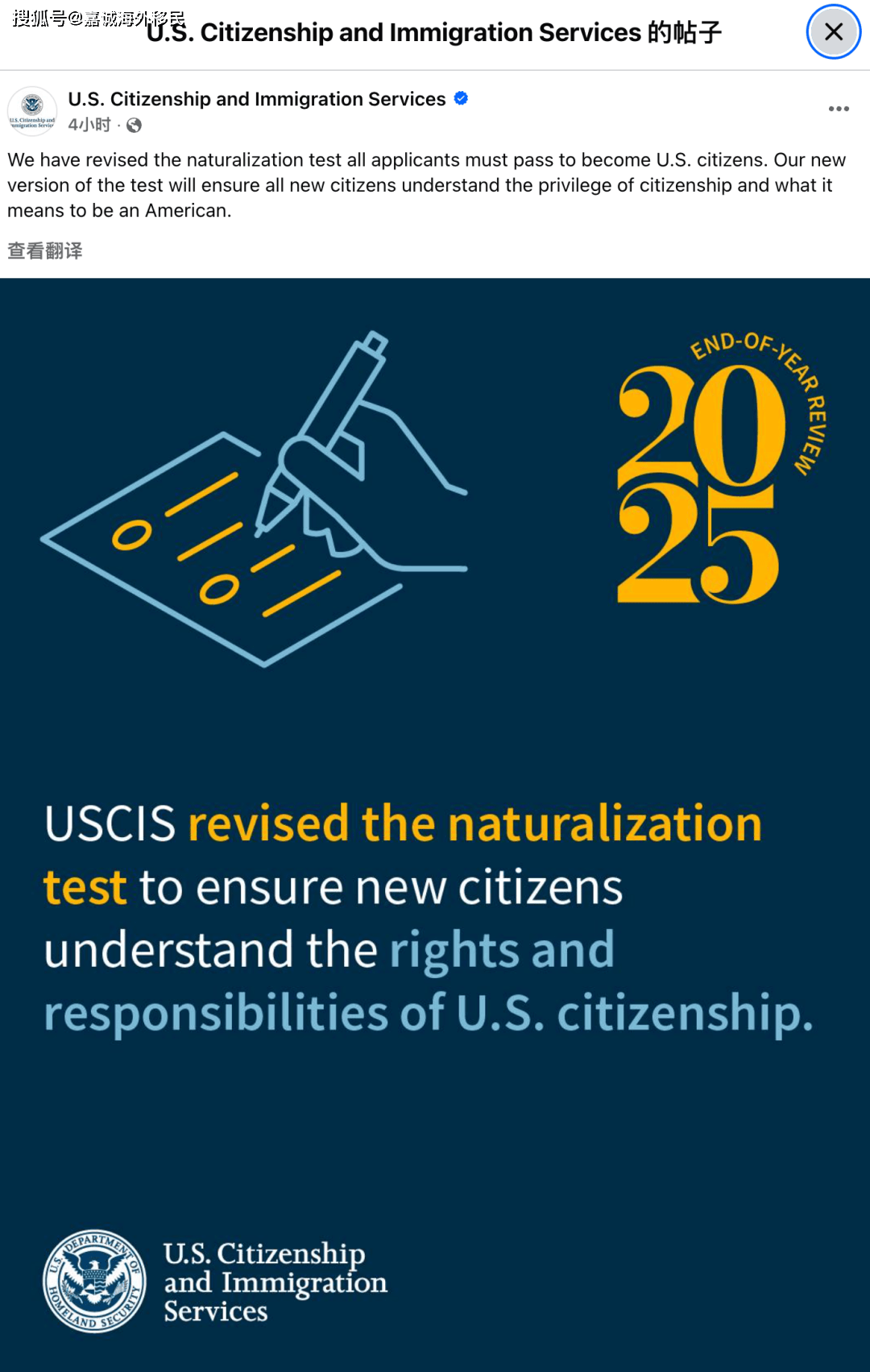 自2025年10月20日起,USCIS全面实施新版2025公民测试。新版考试的题库扩大至128道,涵盖美国政府结构、宪法原则、历史发展以及公民权利与责任等内容,考查深度明显提升。
