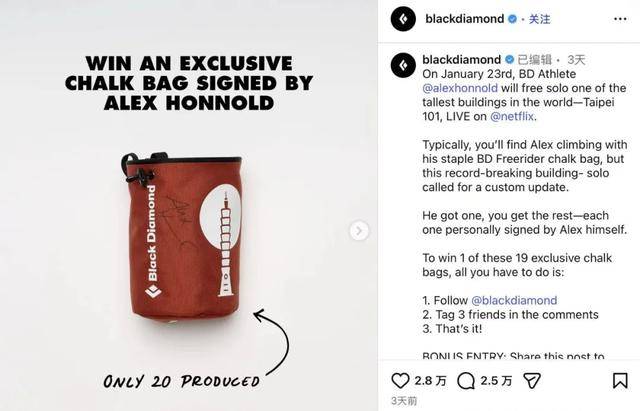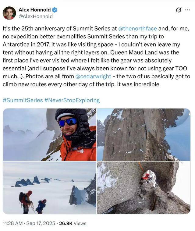 作为知名户外品牌The North Face(北面)签约运动员,Alex这一次攀登期间穿着北面的红色T恤和经专人调整的黑色长裤,着实为品牌带来可观的流量。而在日常,Alex也不时履行品牌代言人义务,在个人社交平台为品牌进行宣传。