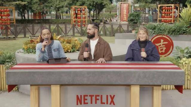 (从左至右)Elle Duncan、Seth Rollins与Emily Harrington在网飞演播室
