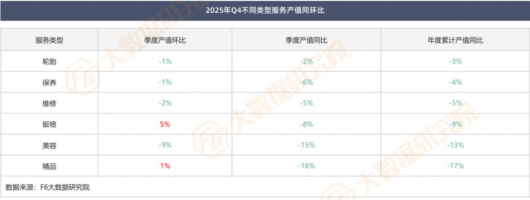 从服务类型看,轮胎、保养、维修三大刚需业务产值同比降幅控制在5%以内,相对“抗跌”。