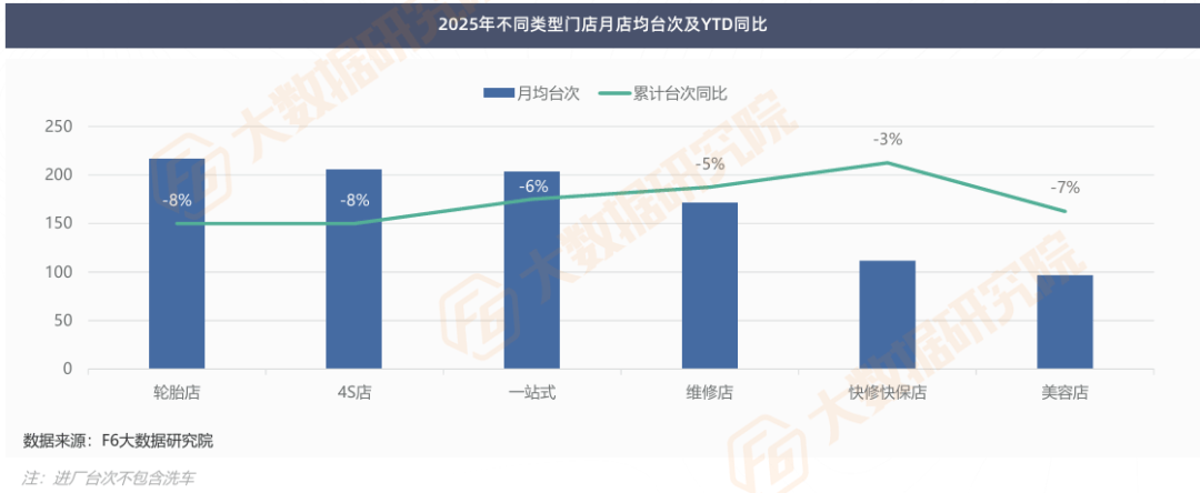 报告显示,2025年后市场细分赛道分化显著。快修快保店表现最为稳健,堪称“抗跌主力”,台次同比仅下滑3%;而轮胎店与4S店成为下滑重灾区,降幅达8%。