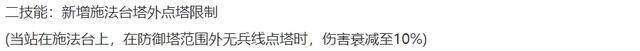 而此次的体验服更新,则会给二技能新增塔外点塔的限制,在没有兵线时会衰减10%伤害,让元辅的对线强度大打折扣。