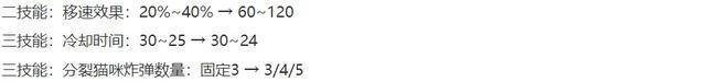 作为补偿,三技能不仅满级CD少了1秒,分裂数量也从固定3个改为3~5个,大幅度提升了消耗能力。