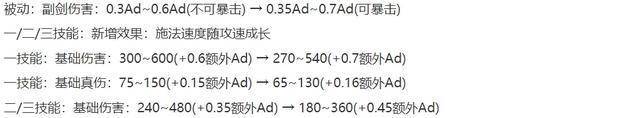 第三个,一二三技能的伤害都会降低10%~15%的基础数值,作为补偿,也会提升1%~10%的额外Ad加成,相当于加强后期削弱前期。