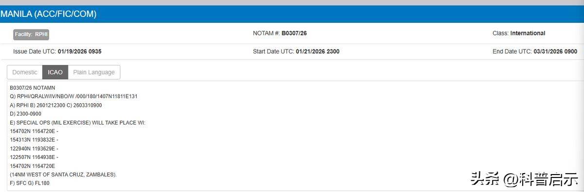 23日,多家外媒报道,菲律宾军方近日发布航空管制通告,在南海黄岩岛附近设军事演习管制区。该管制自1月21日至3月31日,持续近70天,每晚23点至次日9点禁航。管制区北起黄岩岛以北约9海里,覆盖黄岩岛空域,面积达1.5万平方公里,理由是“特殊军事演习”,或与美军进行持续性防空与反舰演练。
