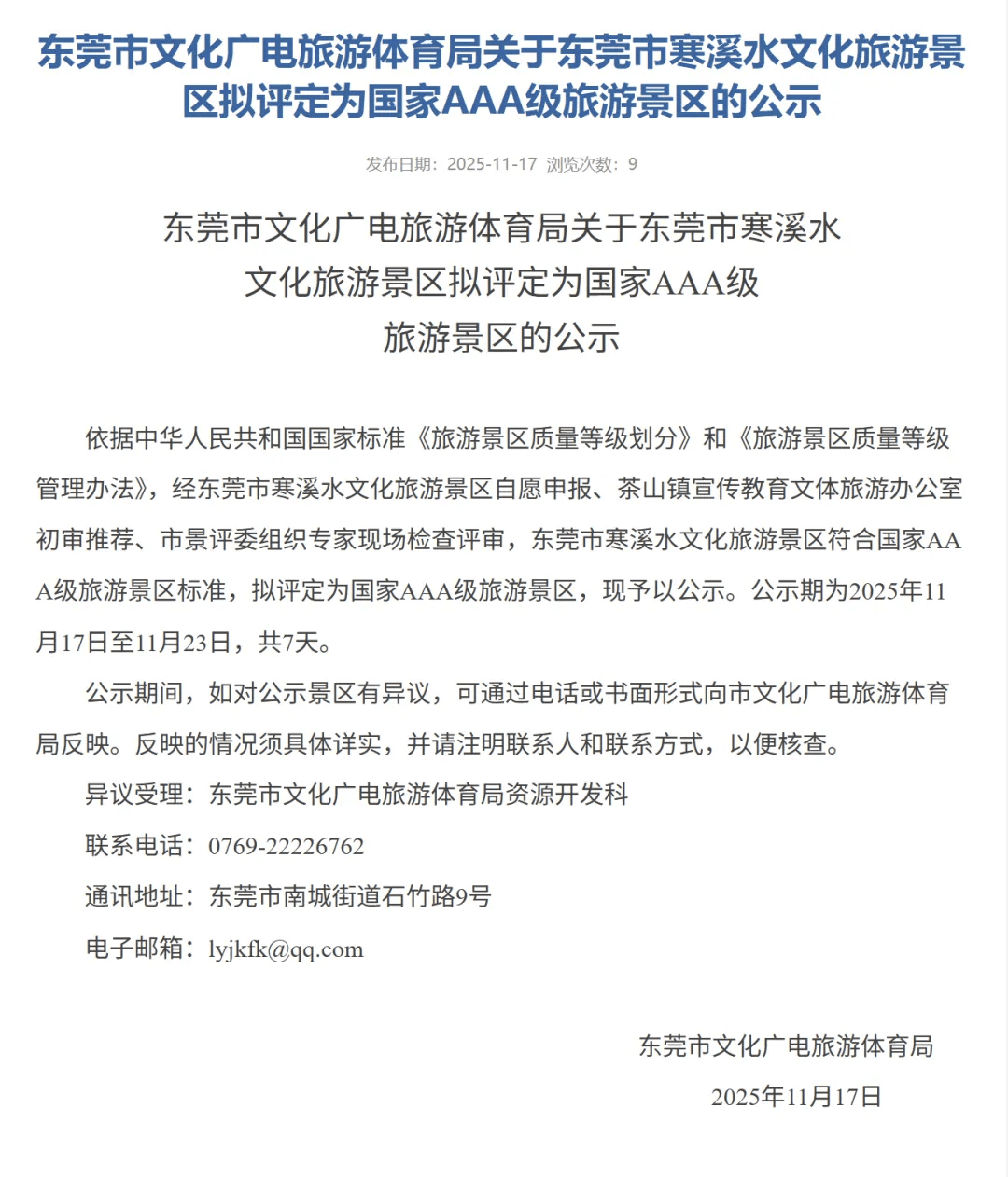 近日,东莞市文化广电旅游体育局发布《关于东莞市寒溪水文化旅游景区拟评定为国家AAA级旅游景区的公示》:经东莞市寒溪水文化旅游景区自愿申报、茶山镇宣传教育文体旅游办公室初审推荐、市景评委组织专家现场检查评审,东莞市寒溪水文化旅游景区符合国家AAA级旅游景区标准,拟评定为国家AAA级旅游景区。