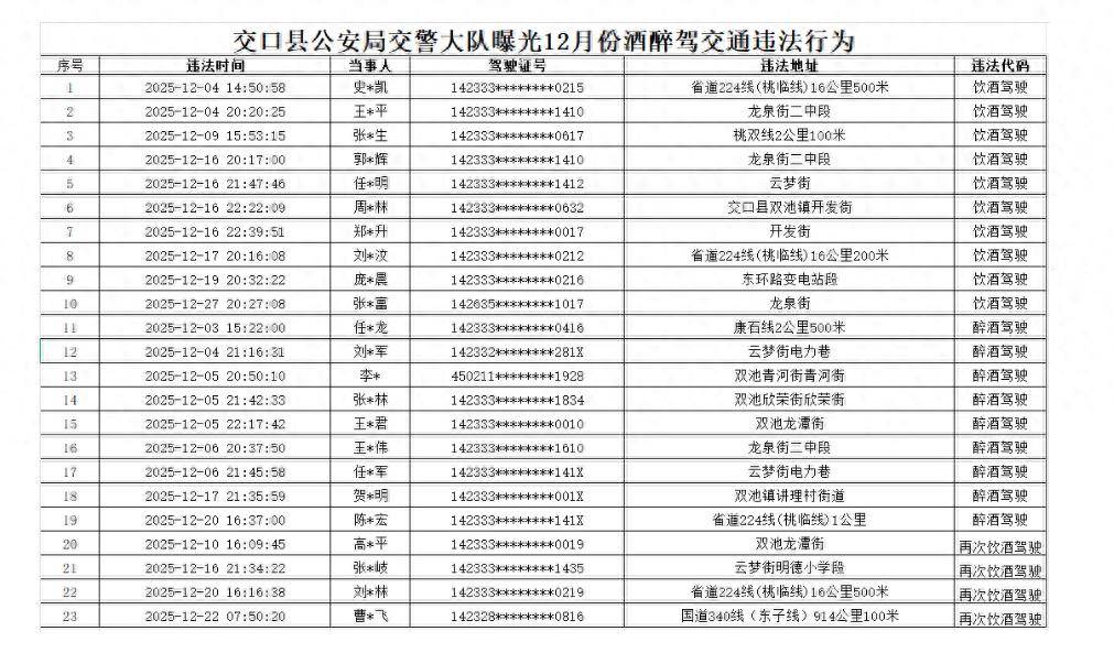 为切实提升全民交通安全意识,坚决预防和减少道路交通事故的发生,保护人民群众生命财产安全,确保辖区道路交通安全形势持续稳定,交口县公安局交管大队强化宣传警示曝光,利用社会和舆论监督,拓宽交通安全宣传警示,震慑交通违法行为,全力维护道路交通安全形势持续平稳。现将2025年十二月份道路交通安全“五大曝光”有关情况发布如下: