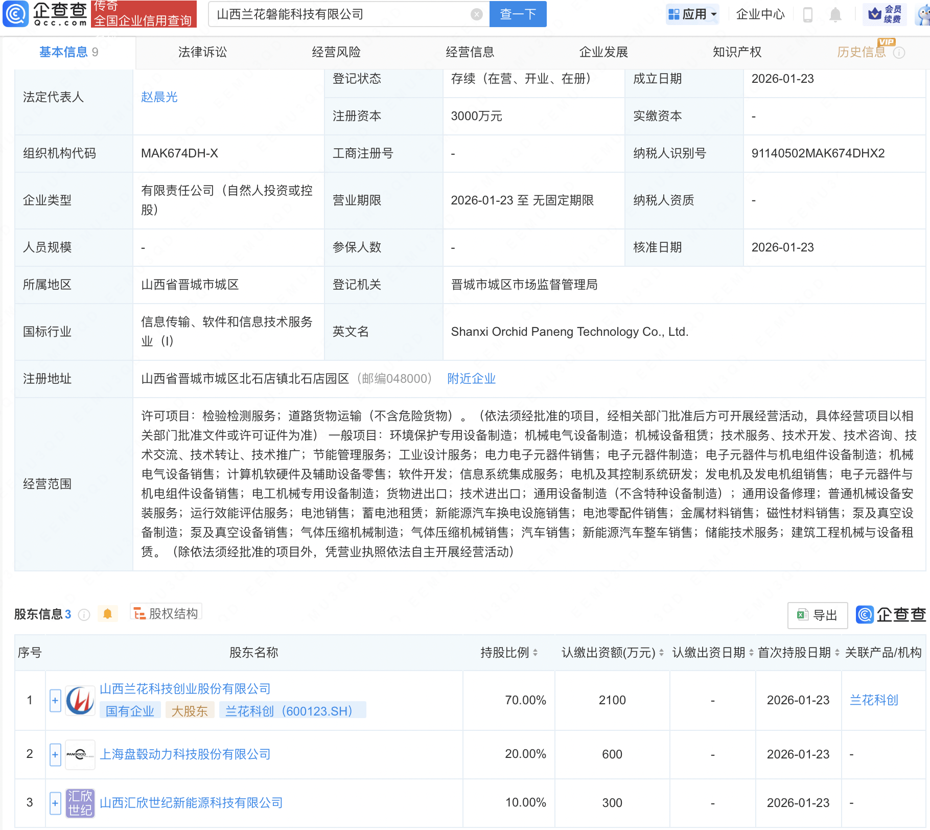 企查查APP显示,近日,山西兰花磐能科技有限公司成立,注册资本3000万元,经营范围包含:电池销售;蓄电池租赁;新能源汽车换电设施销售;电池零配件销售;金属材料销售等。企查查股权穿透显示,该公司由兰花科创(600123)等共同持股。